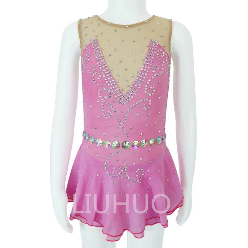 ❤ Features:This LIUHUO figure - skating dress is a charming piece. In a soft pink hue, it has a sleeveless design with a sheer, nude - toned panel at the top. The bodice is lavishly decorated with sparkling rhinestones, forming an elegant pattern. A band of large, iridescent rhinestones encircles the waist, enhancing the silhouette. The flared skirt, also dotted with rhinestones, gives it a playful and graceful look, ideal for skating on the ice.