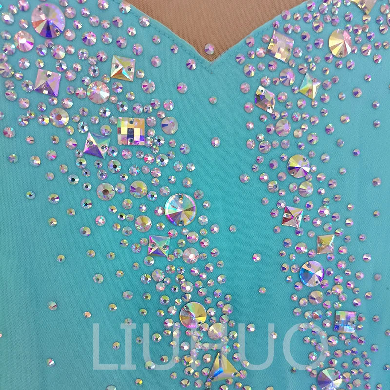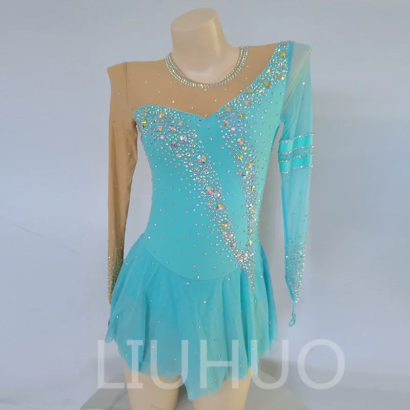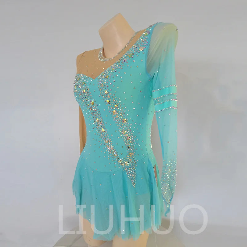 ❤ Features:This LIUHUO skating dress is a charming piece. It features a one - shoulder design with the sheer, flesh - toned sleeve contrasting the light blue bodice. The dress is lavishly adorned with multicolored sparkling rhinestones, creating a dazzling effect. The flared skirt allows for graceful movement, making it ideal for ice skating performances. Its design combines elegance and sparkle, ensuring the wearer stands out on the ice.