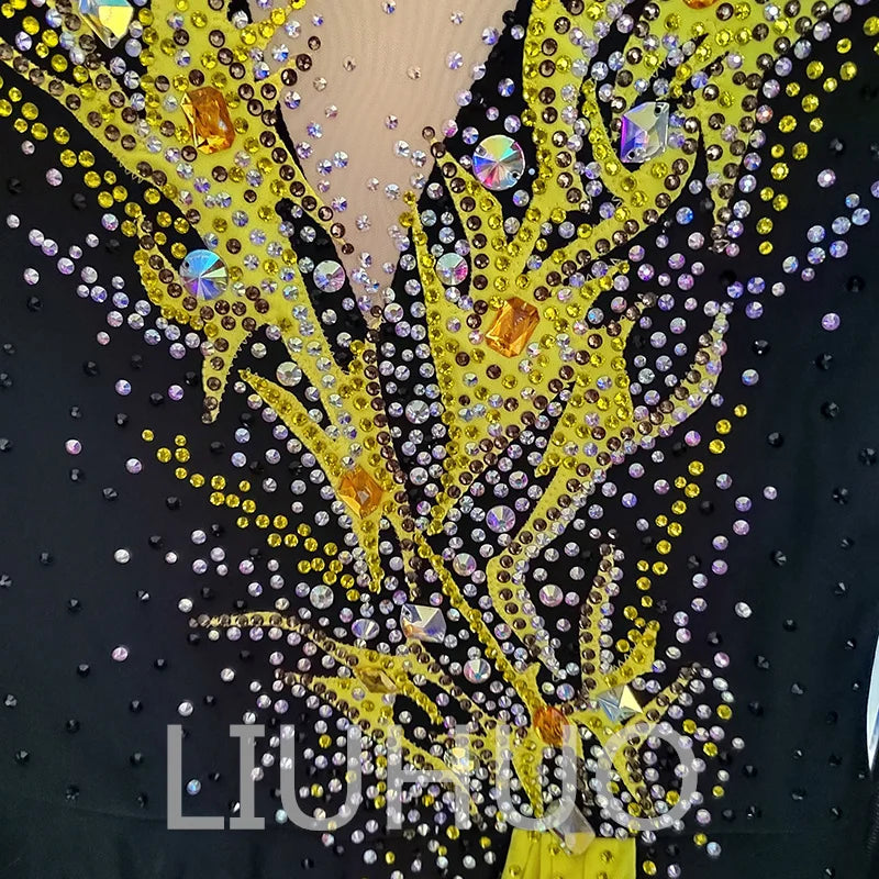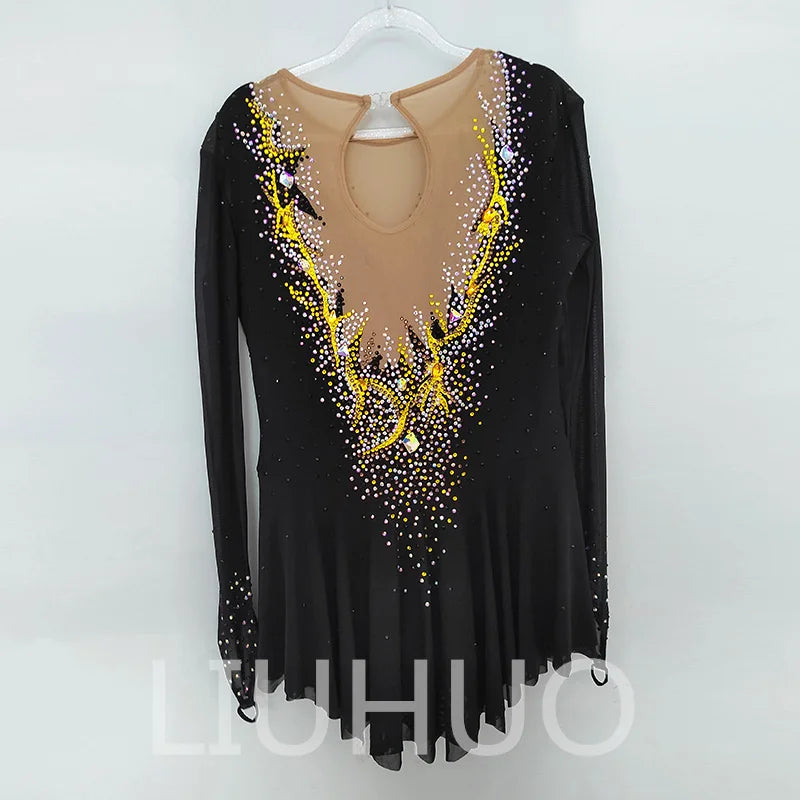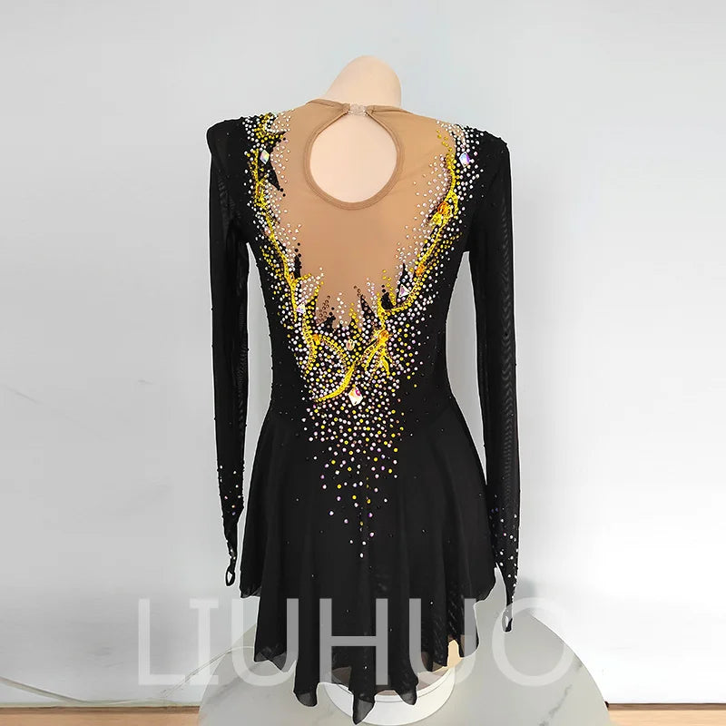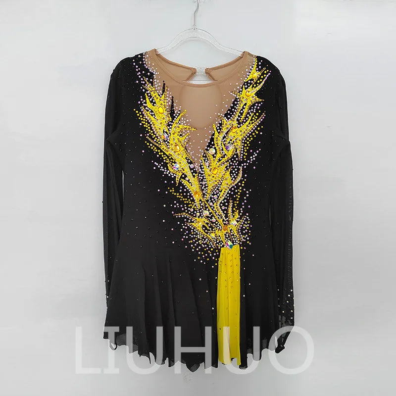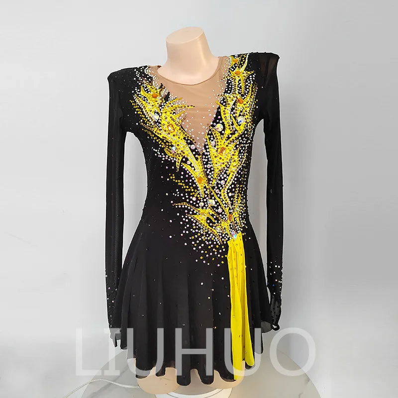 ❤ Features:This LIUHUO skating dress is a striking ensemble. The black base is enlivened by vibrant yellow rhinestone embellishments that form an eye - catching pattern across the bodice. The sheer mesh panel at the neckline adds a touch of allure, while the long sleeves maintain an elegant flow. A yellow fabric accent at the side of the skirt provides a dynamic visual element. This dress combines bold design with graceful details, making it a great choice for ice skating performances.