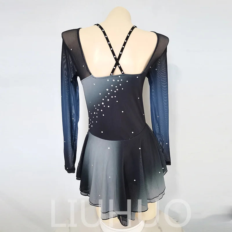 ❤ Features:This LIUHUO skating dress is a chic and elegant choice. It features a long - sleeved design with sheer fabric on the shoulders and upper arms, creating a delicate contrast. The dress showcases a smooth gradient from dark blue to black, exuding a sense of sophistication. Adorned with numerous sparkling rhinestones, they are artfully arranged, adding a touch of glamour. The flared skirt allows for unrestricted movement on the ice, making it perfect for both practice and performance.