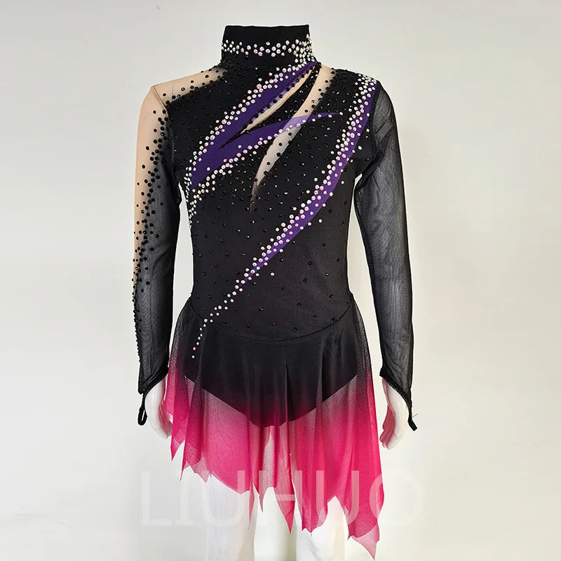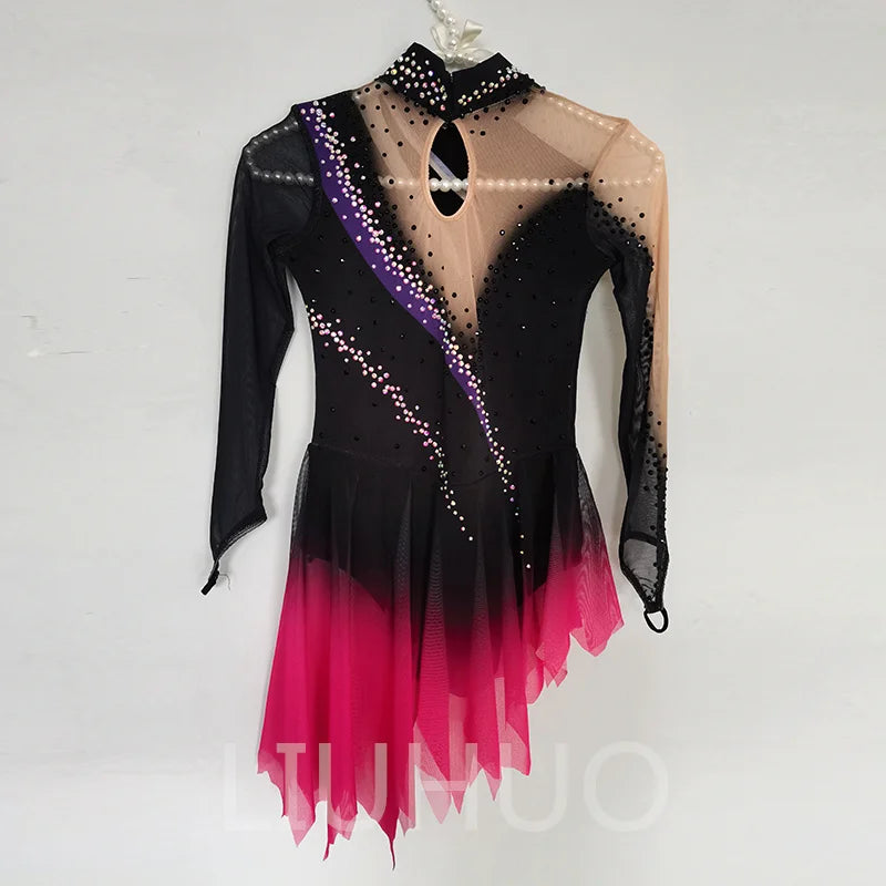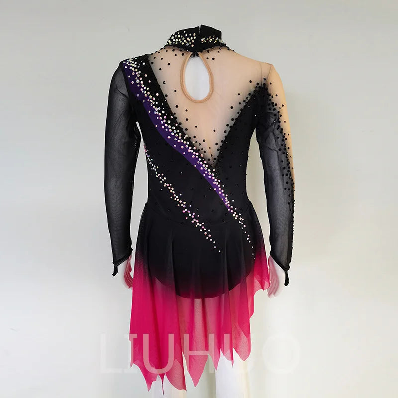❤ Features:This LIUHUO skating dress is a striking piece. It features a high - neck design with long, sheer sleeves. The bodice is predominantly black, adorned with an array of sparkling rhinestones. Vivid purple accents create dynamic diagonal stripes, adding a bold contrast. The skirt showcases a gradient transition from black to pink, with an irregular hemline that enhances movement. Ideal for ice skating performances, it combines elegance and visual impact.