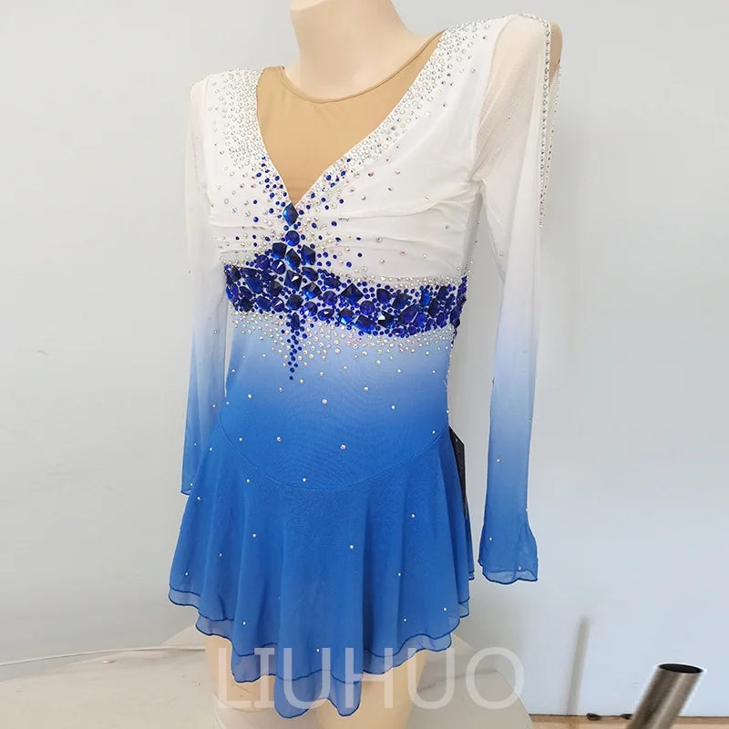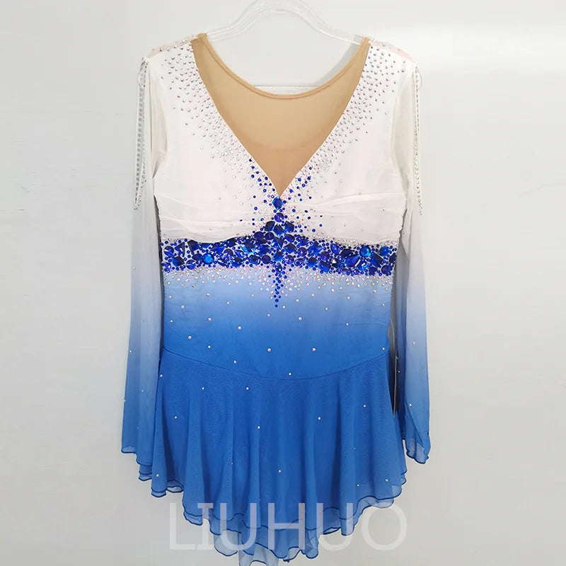 ❤ Features:This LIUHUO figure - skating dress is a graceful and glamorous piece. It features a gradient color scheme transitioning from white to blue, creating a serene and icy visual effect. The long - sleeved design includes sheer mesh sections at the upper part, adding an elegant touch. The bodice is lavishly decorated with numerous rhinestones in blue and clear, arranged in intricate patterns. The V - neckline and the gathered detail at the waist enhance the dress's feminine silhouette. The flared skirt allows for smooth movement, making it an ideal choice for figure - skating performances. This dress combines a soft color palette with elaborate embellishments, ensuring the skater looks elegant on the ice.