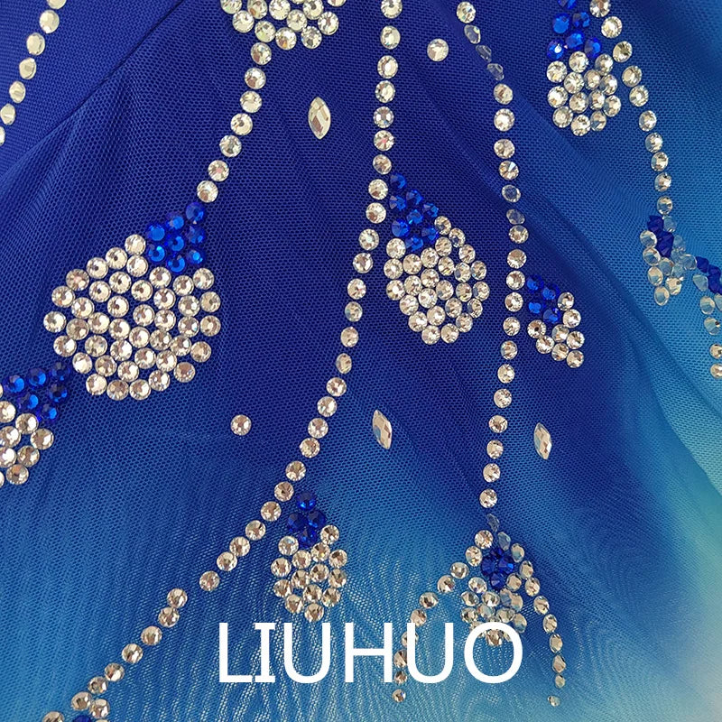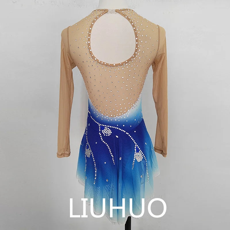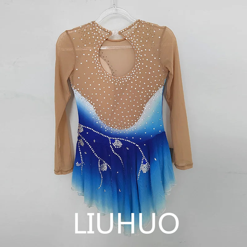 ❤ Features:This LIUHUO figure - skating dress is a striking and elegant creation. It showcases a gradient color scheme transitioning from deep blue at the top to lighter blue towards the bottom of the skirt, creating a visually appealing effect reminiscent of the ocean. The long - sleeved design features sheer mesh sleeves in a nude tone, adding a delicate and sophisticated touch. The bodice is lavishly adorned with numerous sparkling rhinestones meticulously arranged in a pattern that resembles flowing waves or intricate vines, enhancing the dress's glamorous appeal. The flared skirt allows for graceful movement, making it an ideal choice for figure - skating performances, combining both aesthetic beauty and functional design.
