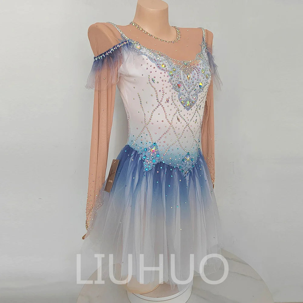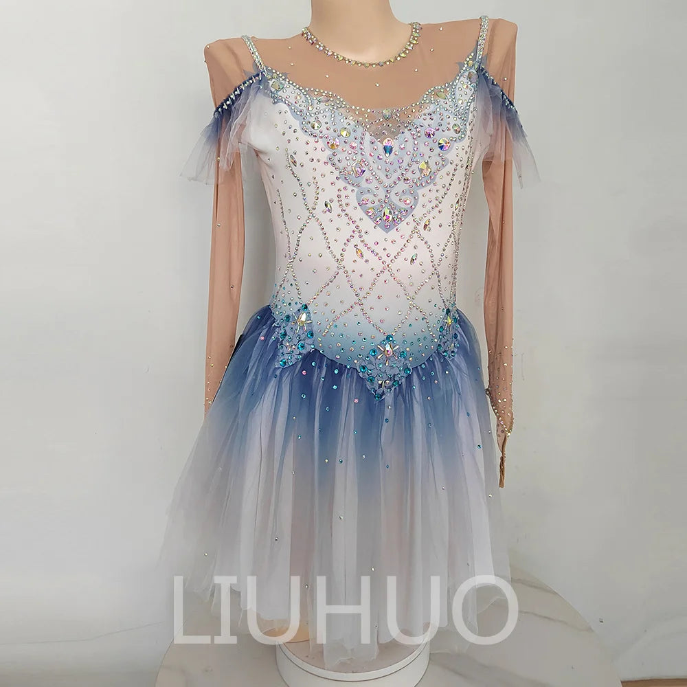 ❤ Features:This LIUHUO figure - skating dress is a stunning and ethereal creation. It features a gradient color scheme transitioning from white to blue, giving it an icy, celestial appearance. The off - the - shoulder design with sheer mesh sleeves adds a delicate and elegant touch. The bodice is lavishly adorned with numerous multicolored rhinestones arranged in intricate patterns, including a prominent heart - shaped motif at the center, enhancing its glamorous appeal. The skirt is made of flowing tulle, which allows for graceful movement, making it an ideal choice for figure - skating performances. This dress combines a soft color palette with elaborate embellishments, ensuring the skater looks like a vision on the ice.