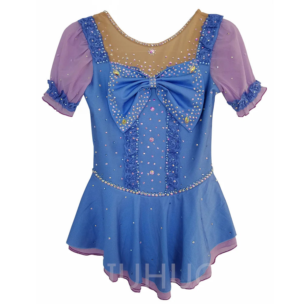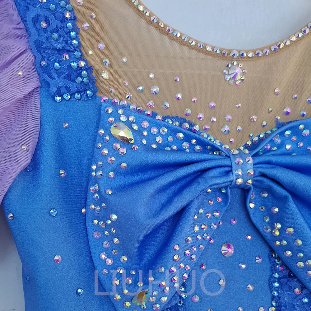 ❤ Features:This LIUHUO figure - skating dress is a charming and elegant piece. It features a light blue base color with a gradient effect, transitioning to a soft purple at the edges of the skirt and sleeves. The short, puffed sleeves are made of sheer purple fabric, adding a delicate and whimsical touch. The bodice is adorned with a large, eye - catching blue bow at the center, surrounded by an array of sparkling rhinestones in various colors. Ruffled lace details enhance the dress's femininity, and the flared skirt allows for graceful movement, making it a delightful choice for figure - skating, especially suitable for younger skaters or themed performances.