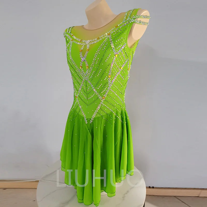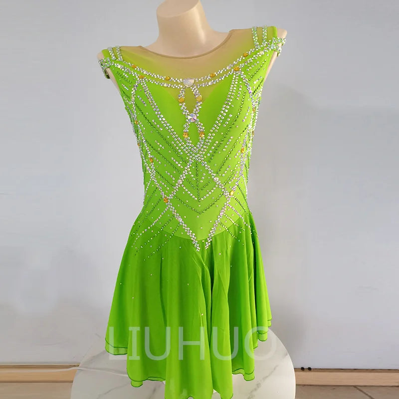 ❤ Features:This LIUHUO figure - skating dress is a vibrant and eye - catching piece. In a bright green color, it features a sleeveless design with a sheer mesh neckline, adding an elegant and delicate touch. The bodice is lavishly adorned with numerous sparkling rhinestones arranged in intricate geometric patterns, creating a dazzling effect. The flared skirt allows for graceful movement, making it both stylish and practical for figure - skating performances. This dress combines a bold color with elaborate detailing, ensuring the skater stands out on the ice.