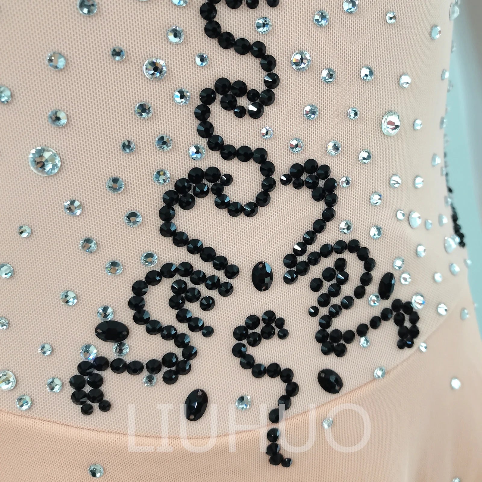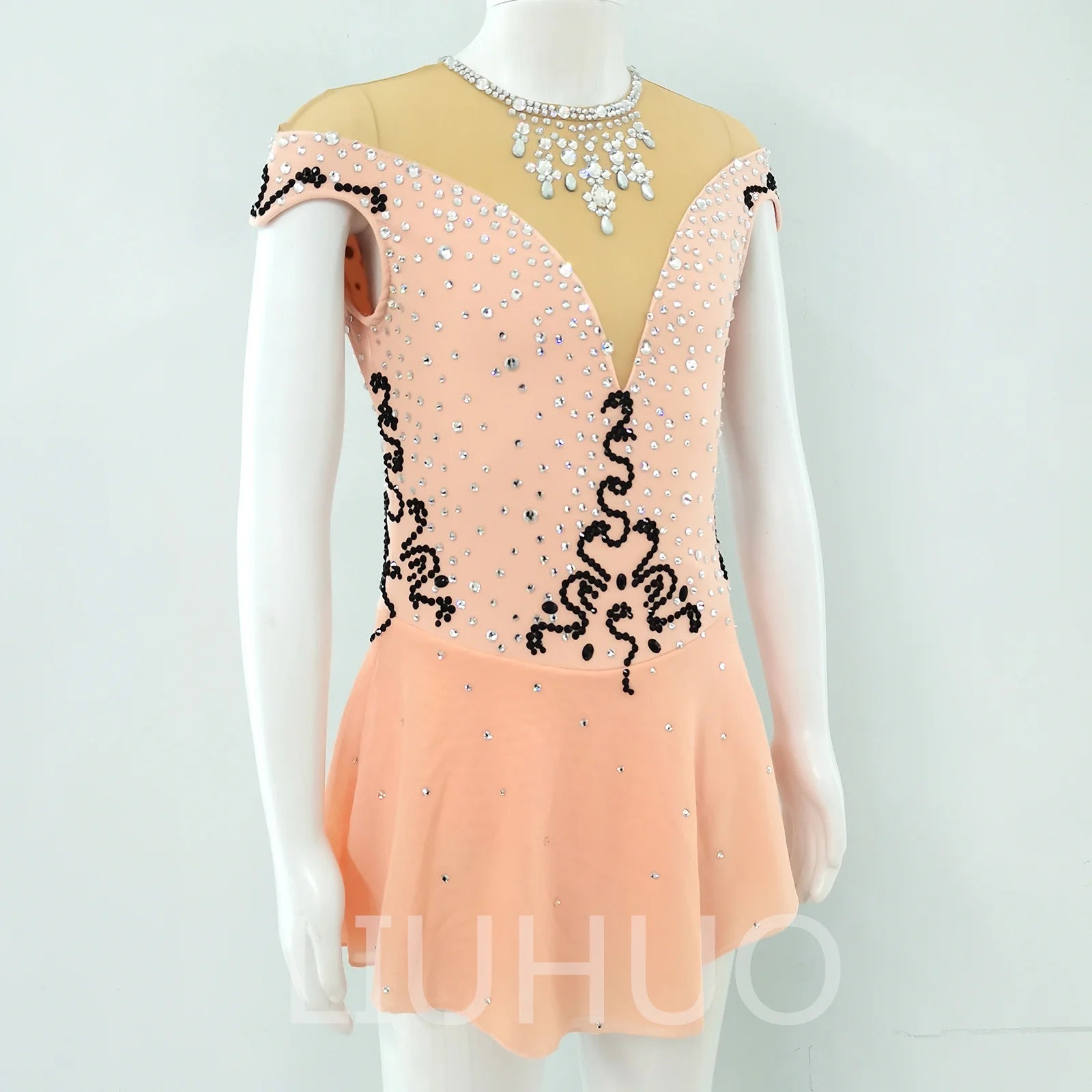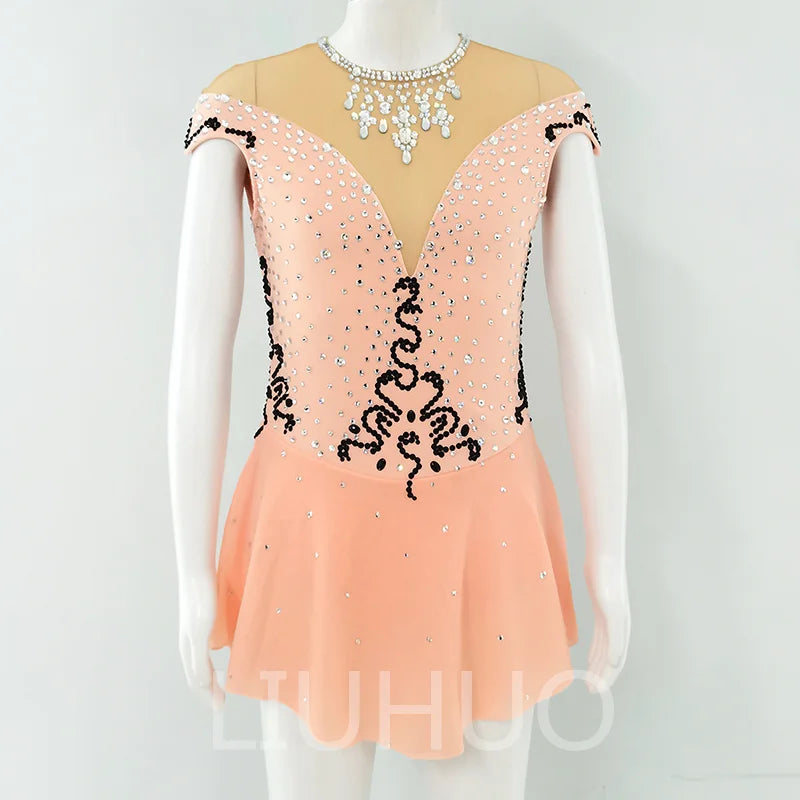 ❤ Features:This LIUHUO figure - skating dress is a delicate and stylish piece. In a soft peach color, it features an off - the - shoulder design with sheer mesh at the upper part, adding an elegant touch. The bodice is densely embellished with numerous sparkling rhinestones, creating a dazzling effect. Black, ornate patterns made of sequins or similar embellishments are prominently placed on the bodice, adding a contrasting and artistic element. The flared skirt allows for graceful movement, making it a charming choice for figure - skating performances. This dress combines a gentle color palette with intricate detailing, ensuring the skater exudes grace and charm on the ice.