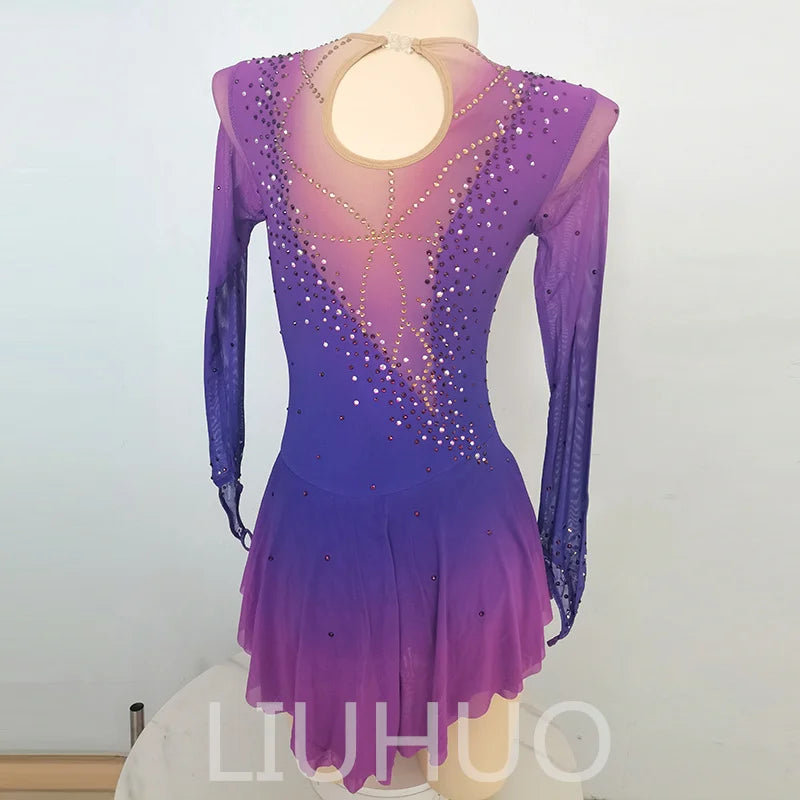 ❤ Features:This LIUHUO figure - skating dress is a captivating and glamorous piece. It showcases a gradient color scheme transitioning from deep purple at the top to lighter purple towards the bottom of the skirt, creating a rich and enchanting visual effect. The long - sleeved design with sheer mesh fabric adds an element of sophistication. The dress is densely adorned with numerous rhinestones meticulously arranged in patterns that enhance its sparkle. The crisscross straps at the neckline add a unique design detail. The flared skirt allows for graceful movement, making it an ideal choice for figure - skating performances, combining both aesthetic allure and practical functionality.