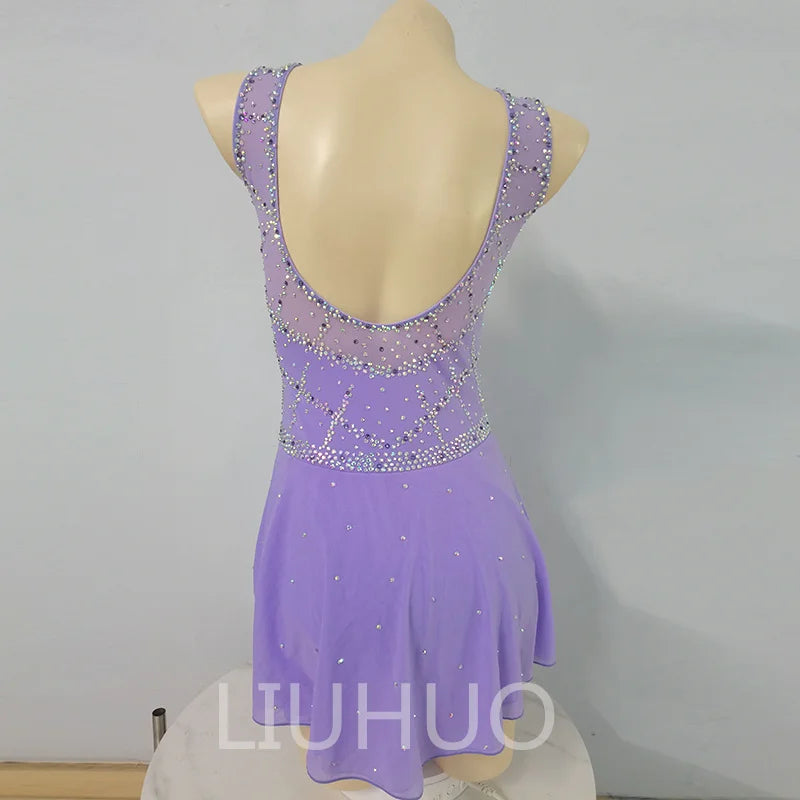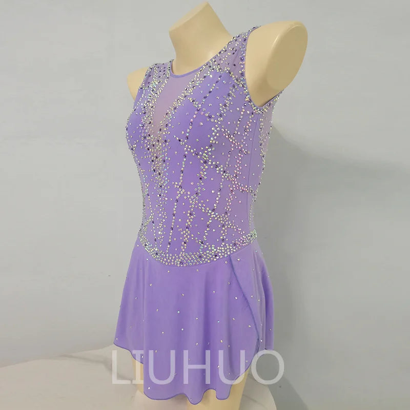 ❤ Features:This LIUHUO figure - skating dress is a vision of elegance and sparkle. In a soft lavender hue, it features a sleeveless design with a sheer mesh upper section. The bodice is lavishly adorned with numerous rhinestones meticulously arranged in geometric patterns, creating a dazzling effect that catches the light from every angle. The skirt is simple yet flowing, allowing for graceful movement during performances. This dress combines a delicate color with elaborate embellishments, making it a perfect choice for figure - skaters looking to make a statement on the ice.