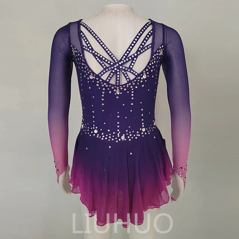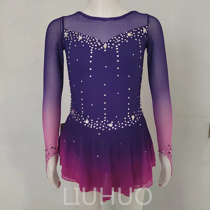 ❤ Features:This LIUHUO figure - skating dress is a captivating and elegant piece. It features a gradient color scheme transitioning from deep purple at the top to pink at the bottom of the skirt, creating a dreamy and enchanting visual effect. The long - sleeved design with sheer mesh fabric adds a delicate and sophisticated touch. The dress is adorned with numerous sparkling rhinestones meticulously arranged in patterns that outline the bodice and sleeves, enhancing its glamorous appeal. The flared skirt allows for graceful movement, making it an ideal choice for figure - skating performances, combining both aesthetic beauty and practical functionality.
