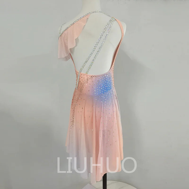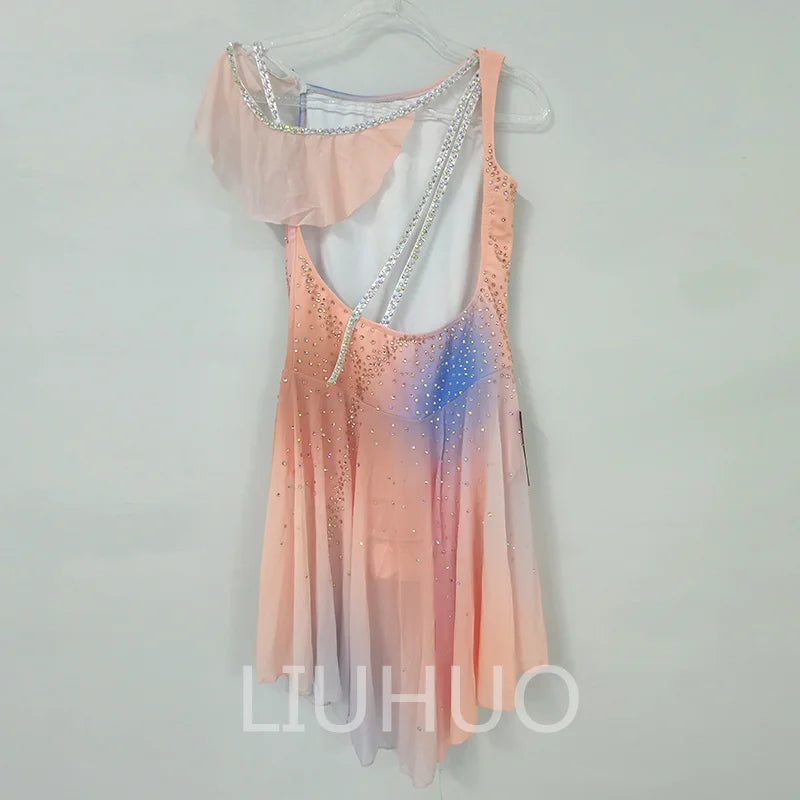 ❤ Features:This LIUHUO figure - skating dress is a charming and elegant piece. In a soft gradient of pastel colors including pink, peach, and hints of blue, it exudes a gentle and dreamy aesthetic. The sleeveless design with an asymmetric shoulder adds a modern and stylish touch. The entire dress is adorned with numerous sparkling rhinestones, meticulously arranged to create a pattern that enhances its beauty. The flared skirt allows for graceful movement, making it an ideal choice for figure - skating performances. This dress combines a delicate color palette with intricate embellishments, ensuring the skater looks both elegant and eye - catching on the ice.