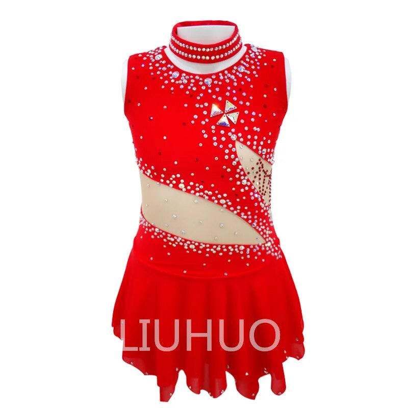 ❤ Features:This is a figure - skating dress from the brand LIUHUO. It is a vibrant red color with a sleeveless design. The neckline is decorated with multiple layers of rhinestones. The dress is covered with sparkling rhinestones, forming an exquisite pattern. There is a section of nude - colored mesh fabric for added design flair. The skirt has a ruffled hem, which is light and dynamic, making it suitable for showcasing vitality and elegance during figure - skating performances.