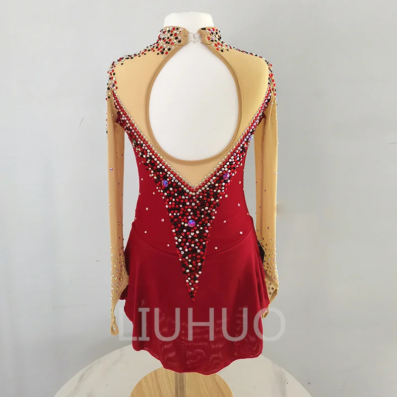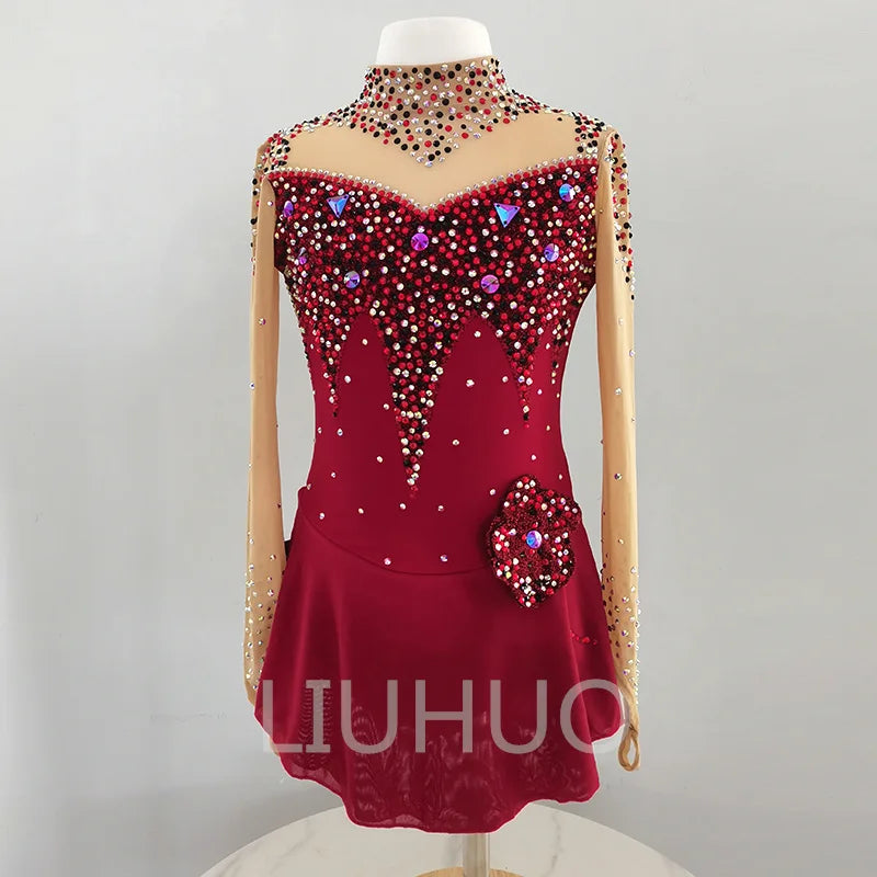 ❤ Features:This LIUHUO figure - skating dress is a striking and glamorous creation. In a deep red hue, it features a high - neck design with sheer mesh sleeves, adding an elegant and somewhat mysterious allure. The bodice is densely adorned with a profusion of rhinestones in various colors, including black, white, and purple, meticulously arranged in patterns that cascade down from the neckline. A large, intricately embellished floral - like motif on the skirt adds a focal point of sparkle. This dress combines bold color with elaborate detailing, making it a perfect choice for figure - skating performances, ensuring the wearer stands out on the ice.