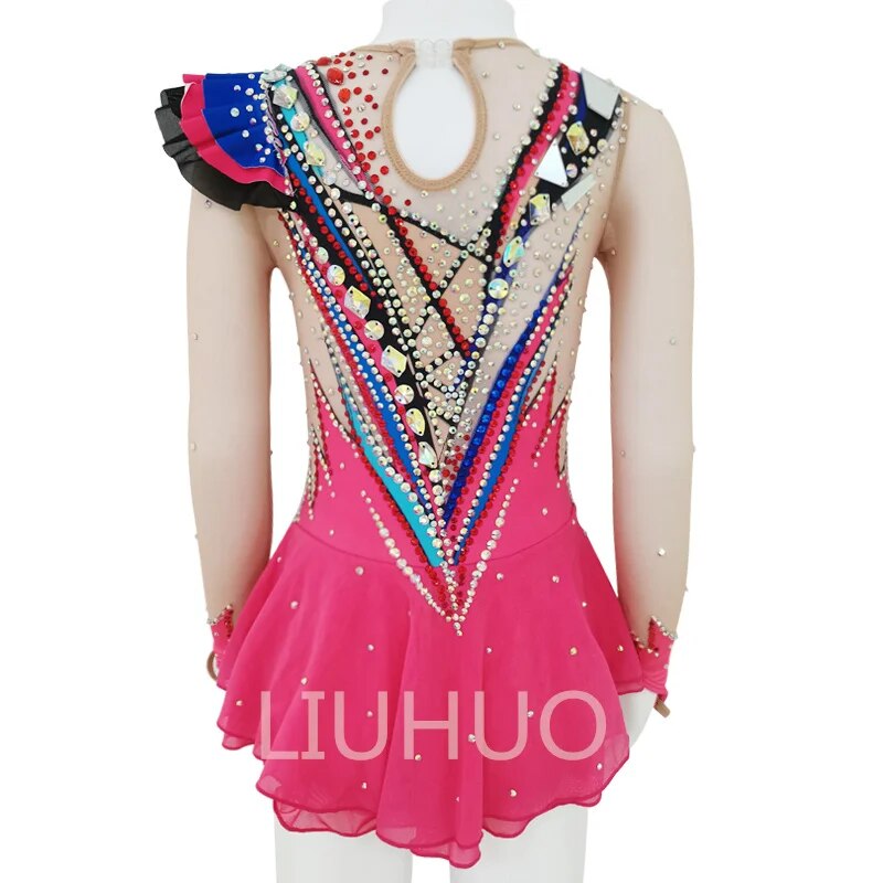 ❤ Features:This LIUHUO figure - skating dress is a vibrant and eye - catching piece. The main body is in a bright pink color. The bodice features a striking design with a variety of colorful rhinestones and beads arranged in geometric patterns, creating a dazzling effect. There is a one - shoulder ruffled detail in blue, black, and pink, adding a dynamic and stylish touch. The long, sheer sleeves are also adorned with embellishments that match the bodice. The flared skirt is simple yet elegant, making it perfect for showcasing graceful movements during figure - skating performances.