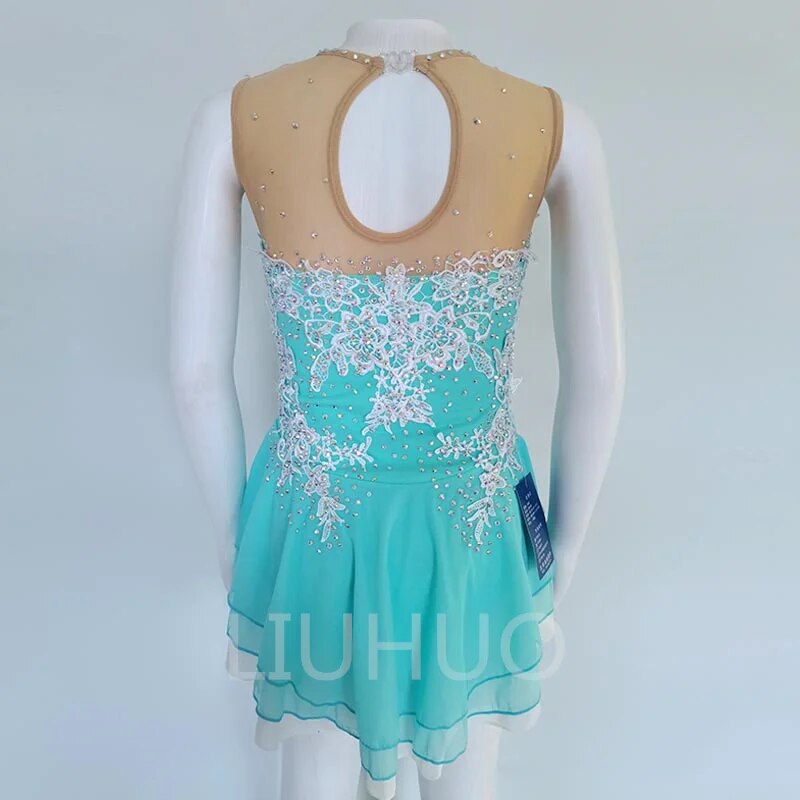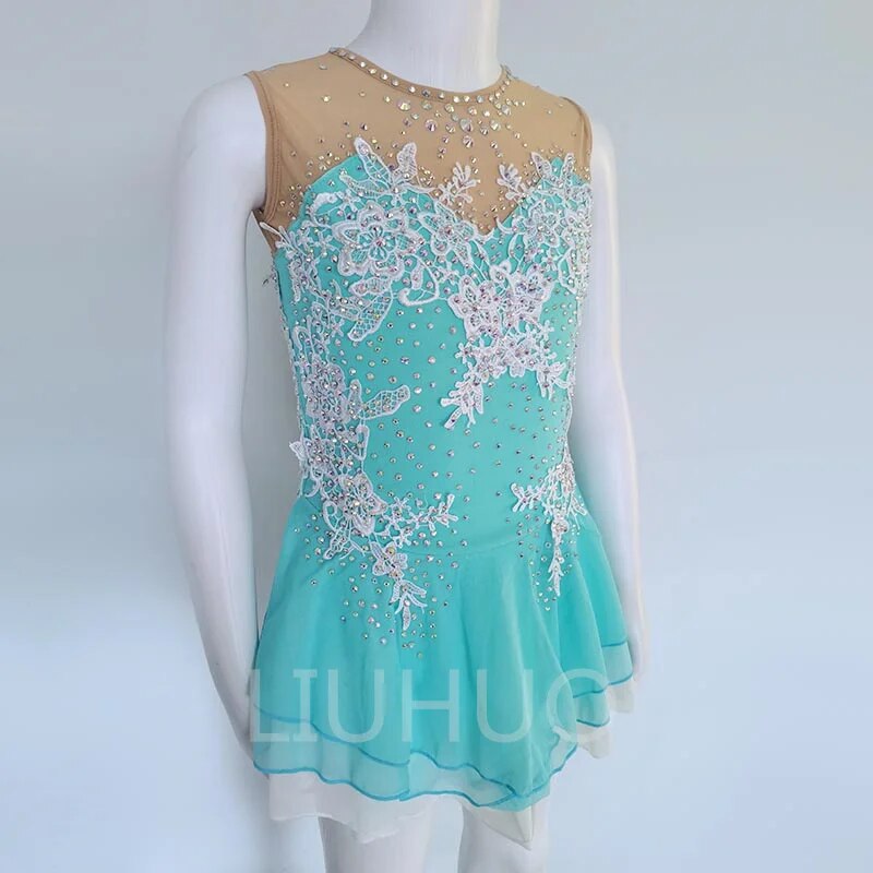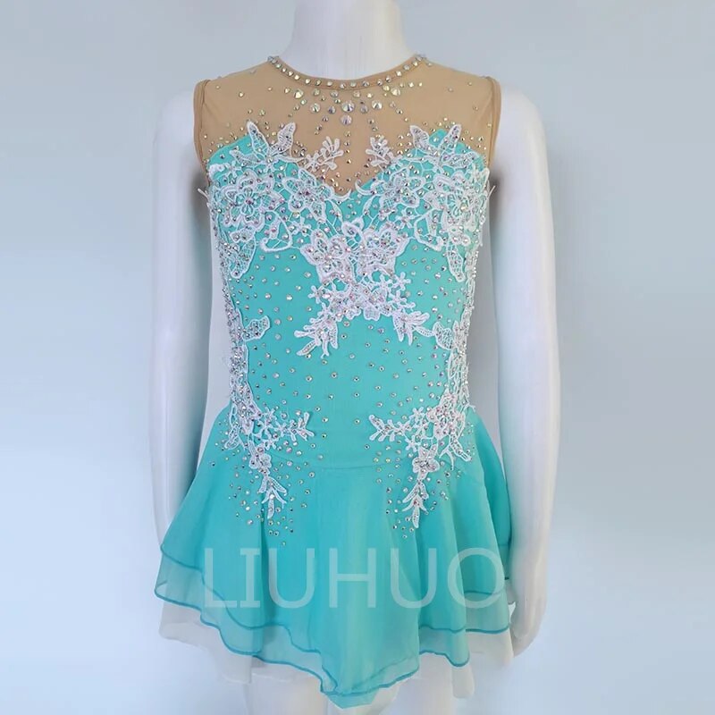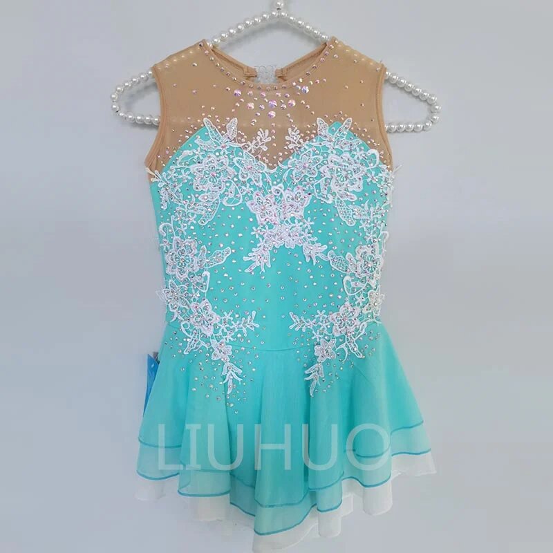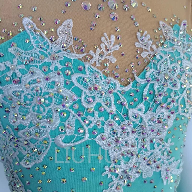 ❤ Features:This sleeveless figure - skating dress is a vision of elegance. The bodice is a beautiful turquoise color, adorned with intricate white lace - like embroidery and numerous sparkling rhinestones, creating a luxurious and eye - catching pattern. The sheer mesh panel at the neckline is embellished with smaller rhinestones, adding a delicate touch. The flared skirt is made of a flowing, translucent fabric in the same turquoise hue, giving it a graceful silhouette that's perfect for ice - skating performances.