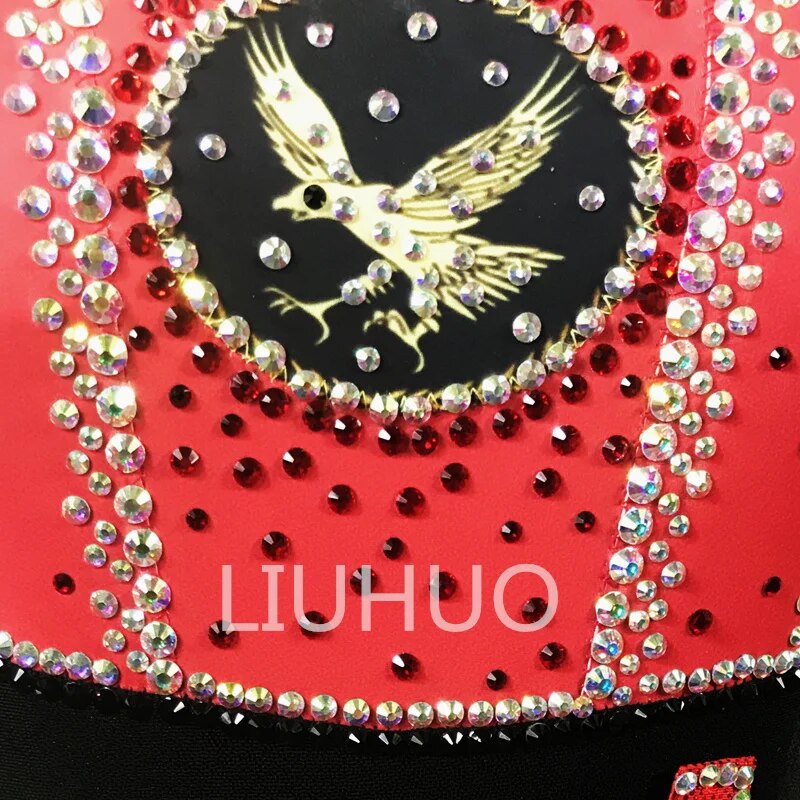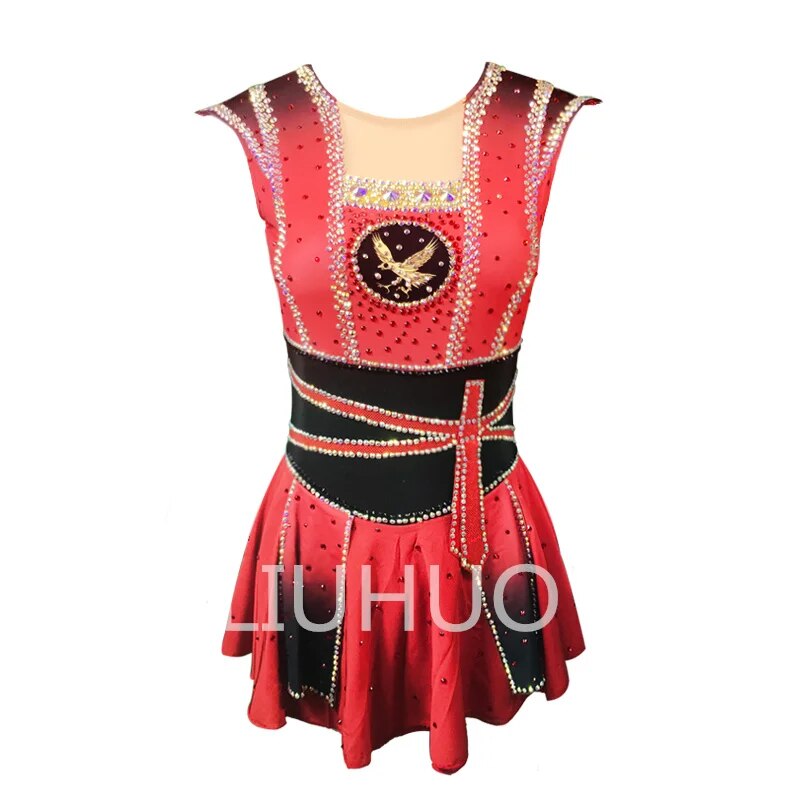 ❤ Features:This LIUHUO figure - skating dress is a striking piece. Dominated by a vivid red color, it catches the eye instantly. The sleeveless top features a square neckline and is embellished with numerous sparkling rhinestones. A prominent circular emblem with a golden bird motif sits at the chest, adding a touch of uniqueness.
