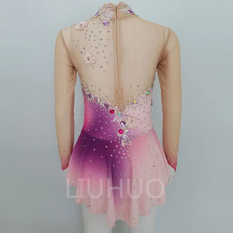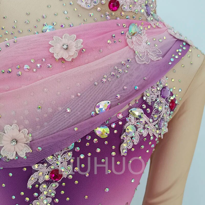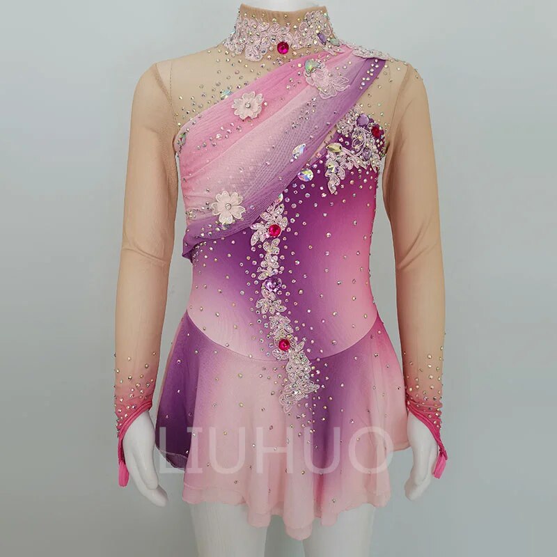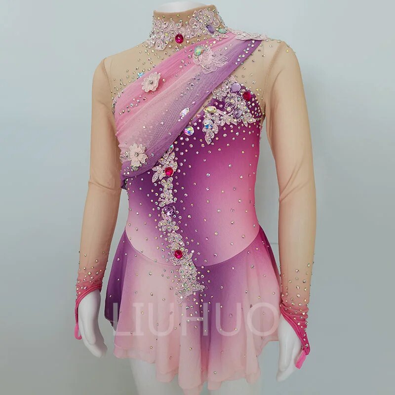 ❤ Features:This is a long - sleeved figure - skating dress. It features a stunning gradient from light pink to deep purple. The high - neck design includes a sheer mesh panel, embellished with a profusion of sparkling rhinestones and delicate floral appliqués, some of which are accented with vibrant red gemstones. A one - shoulder draped fabric in pink adds a flowing, elegant touch. The sleeves are sheer with rhinestone detailing, and the flared skirt complements the overall look, making it perfect for figure - skating performances with its blend of glamour and movement - friendly design.