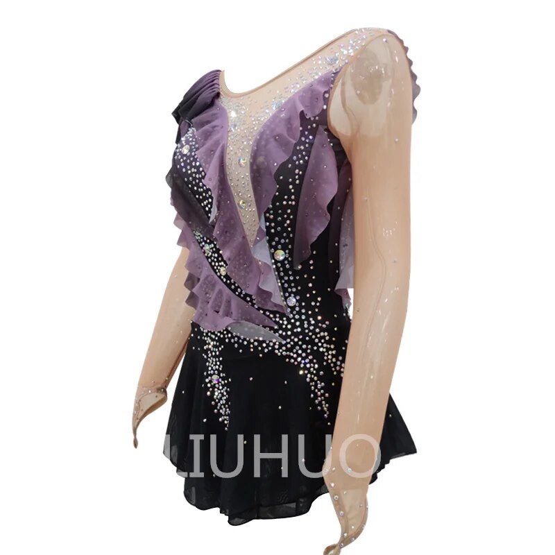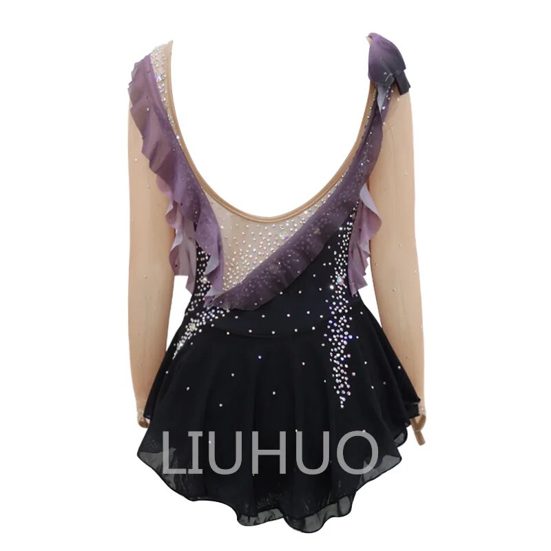 ❤ Features:This LIUHUO figure - skating dress is a captivating blend of elegance and style. The base color is black, with sheer, nude - toned long sleeves. The bodice is adorned with an eye - catching arrangement of purple ruffled fabric that cascades diagonally, creating a dynamic look. Sparkling rhinestones are meticulously placed across the dress, adding a touch of glamour. A ruffled detail on the shoulder enhances the dress's unique aesthetic, while the flared skirt allows for graceful movement on the ice, making it perfect for performances.