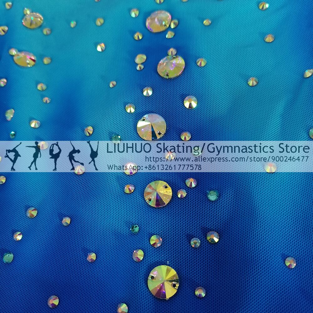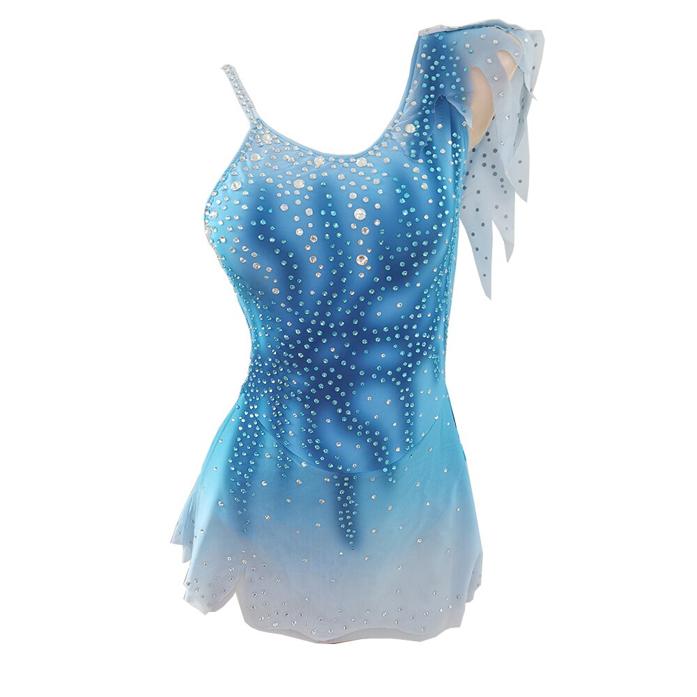 ❤ Features:This LIUHUO skating dress has a gradient from blue to light - blue as its base color, adorned with numerous shiny rhinestones. It's a one - shoulder design with a thin strap on one side and feather - or ribbon - like decorations on the other, looking light and elegant. The white background makes the dress stand out.