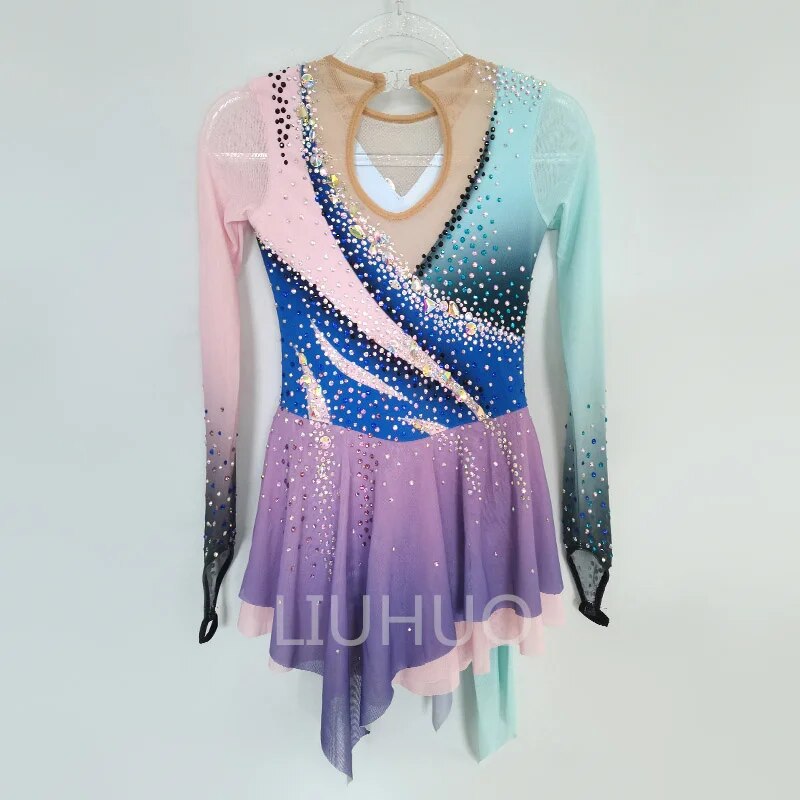 ❤ Features:This is a figure - skating dress from the brand LIUHUO. It is rich in color, with the long - sleeved part gradually changing from light blue to pink. The upper body is mainly blue, with decorative areas in pink, black, etc., all adorned with sparkling rhinestones that form a unique pattern. The skirt is purple and also embellished with rhinestones. The overall style is gorgeous, making it suitable for showcasing graceful postures during figure - skating performances.