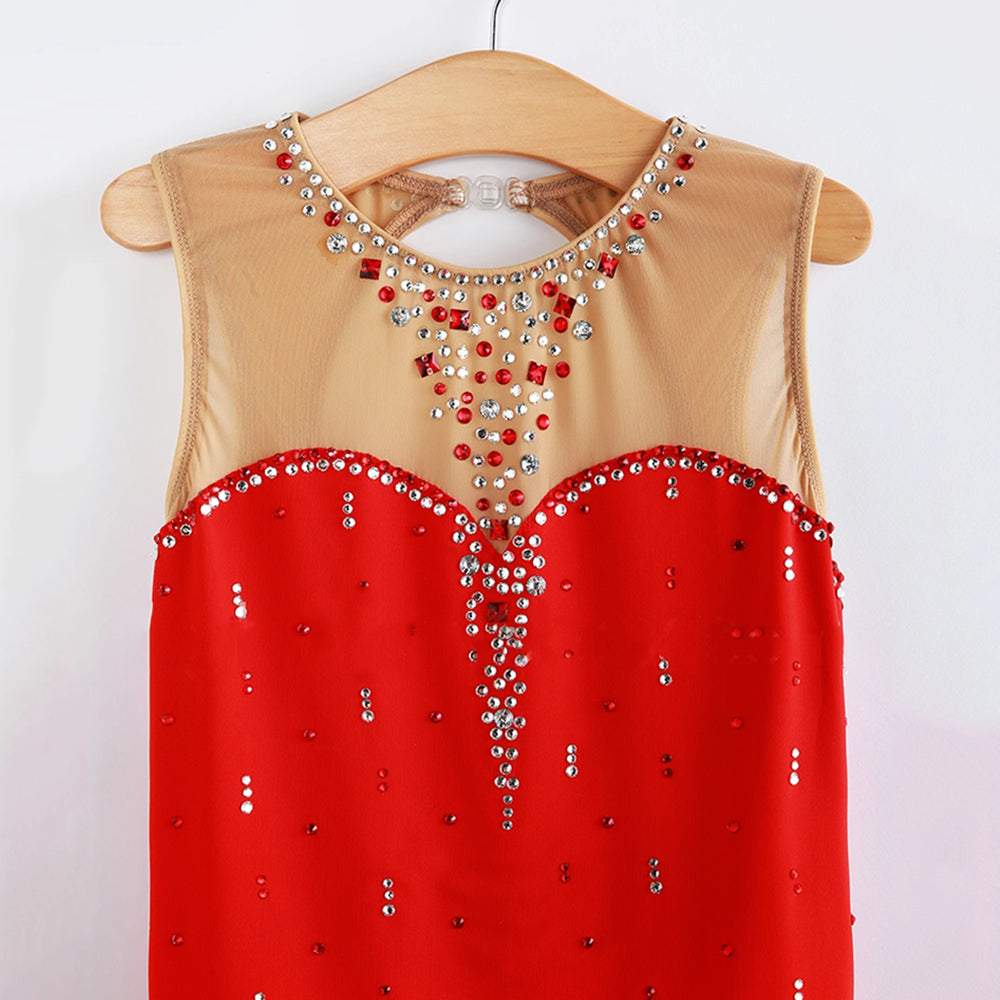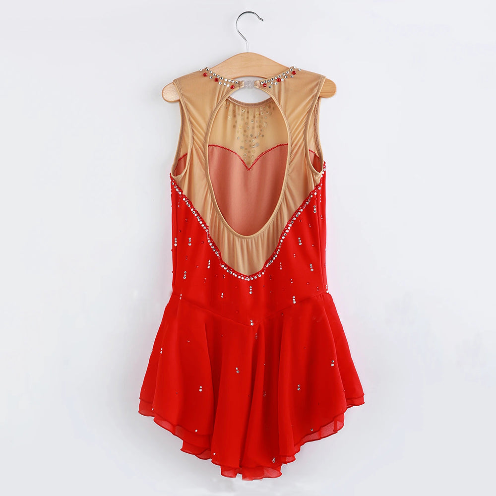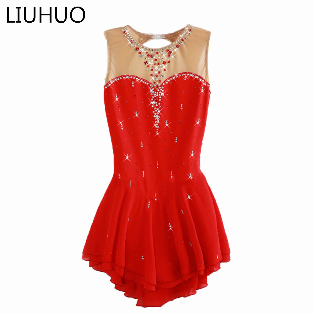 ❤ Features:This LIUHUO figure - skating dress is sleeveless, with a sheer upper panel and a vibrant red skirt. It’s adorned with sparkling rhinestones in a heart - inspired pattern at the neckline and scattered across the dress. The double - layered, flared skirt adds elegance, perfect for women and girls in skating shows.