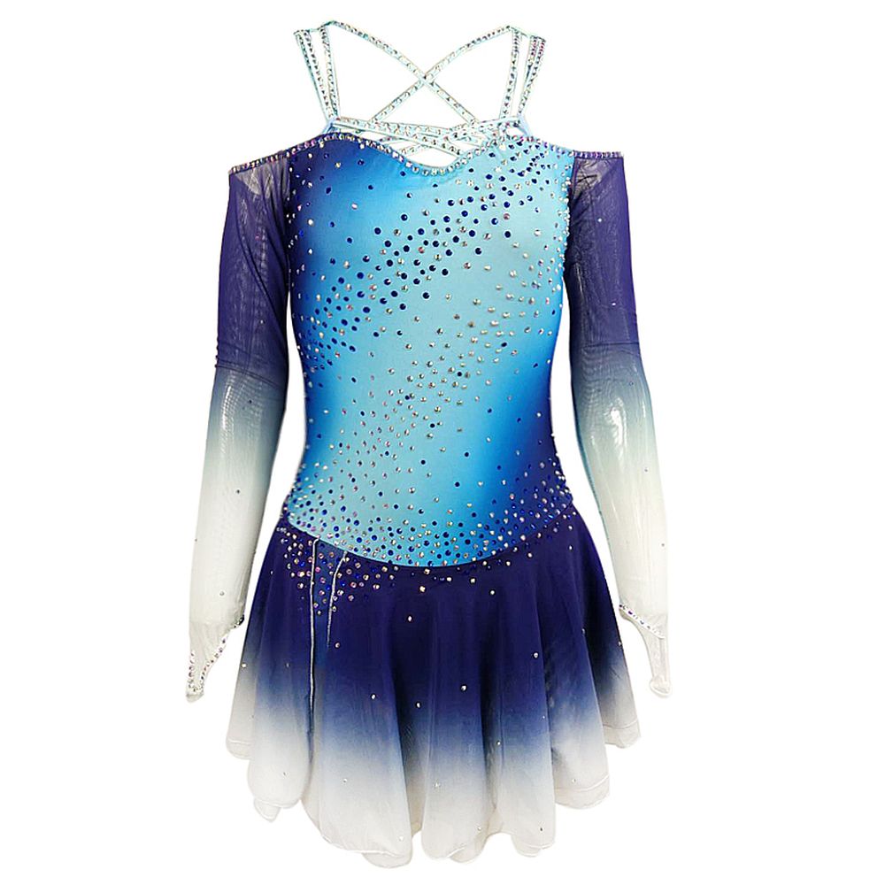 ❤ Features:This LIUHUO figure skating dress features a beautiful blue - to - white gradient. It has sheer, gradient - colored sleeves and a crisscross - strap neckline adorned with rhinestones. The bodice and skirt are decorated with scattered sparkling stones, creating an elegant and eye - catching look for skaters.
