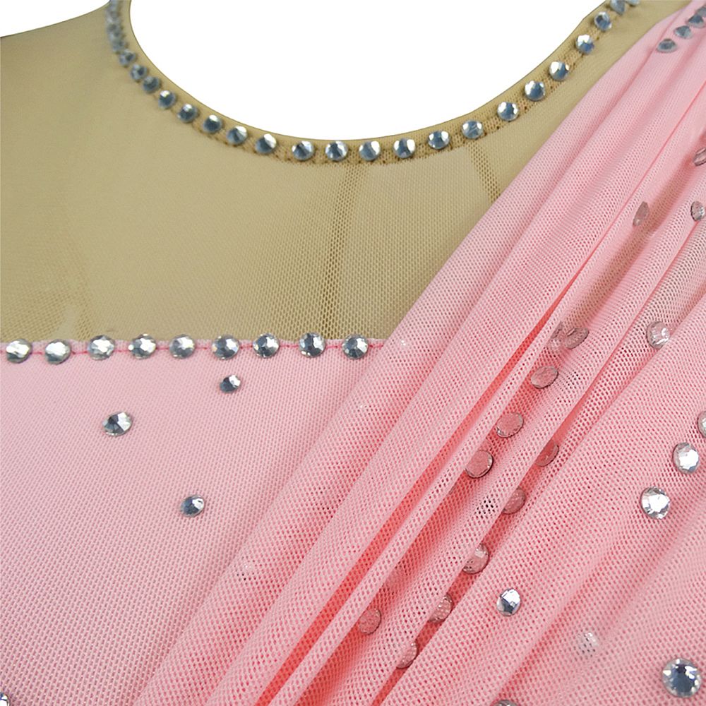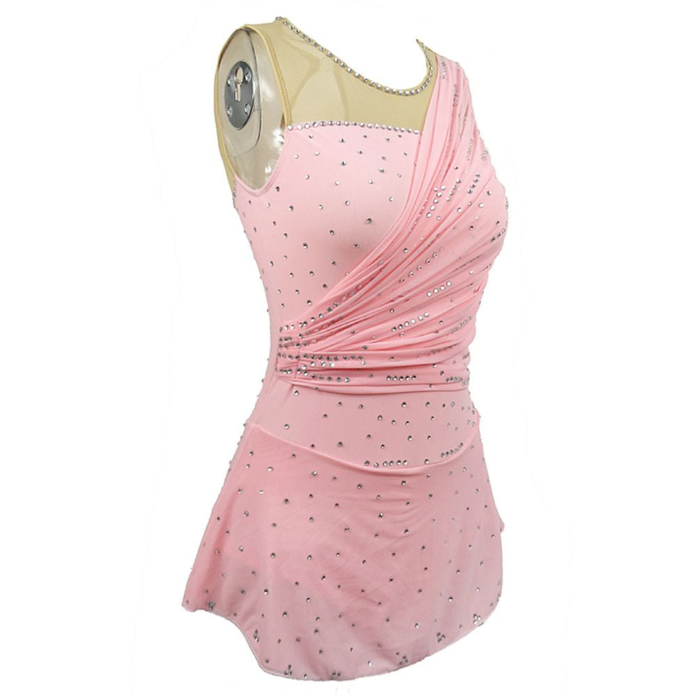 ❤ Features:This LIUHUO figure skating dress is soft pink, with a one - shoulder design and a sheer beige neckline trimmed with rhinestones. The bodice has a ruched detail and is adorned with scattered sparkling stones, and the skirt continues the stone - decorated style, creating a delicate and elegant look for skaters.