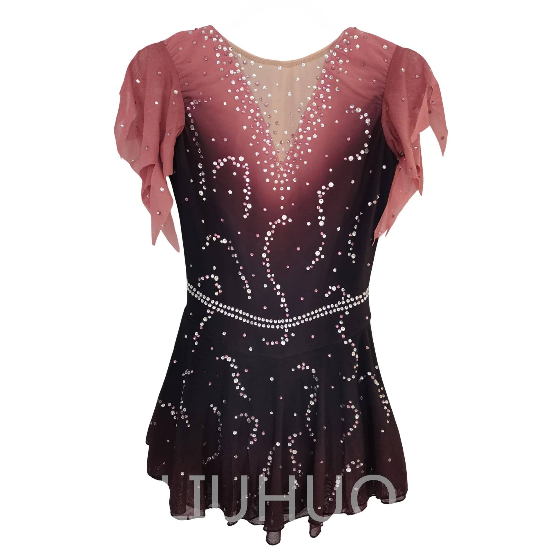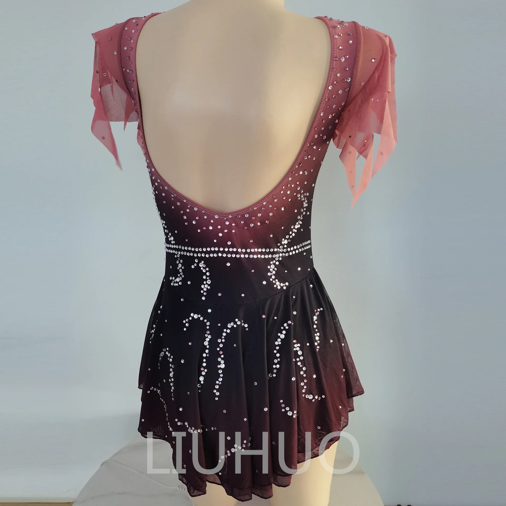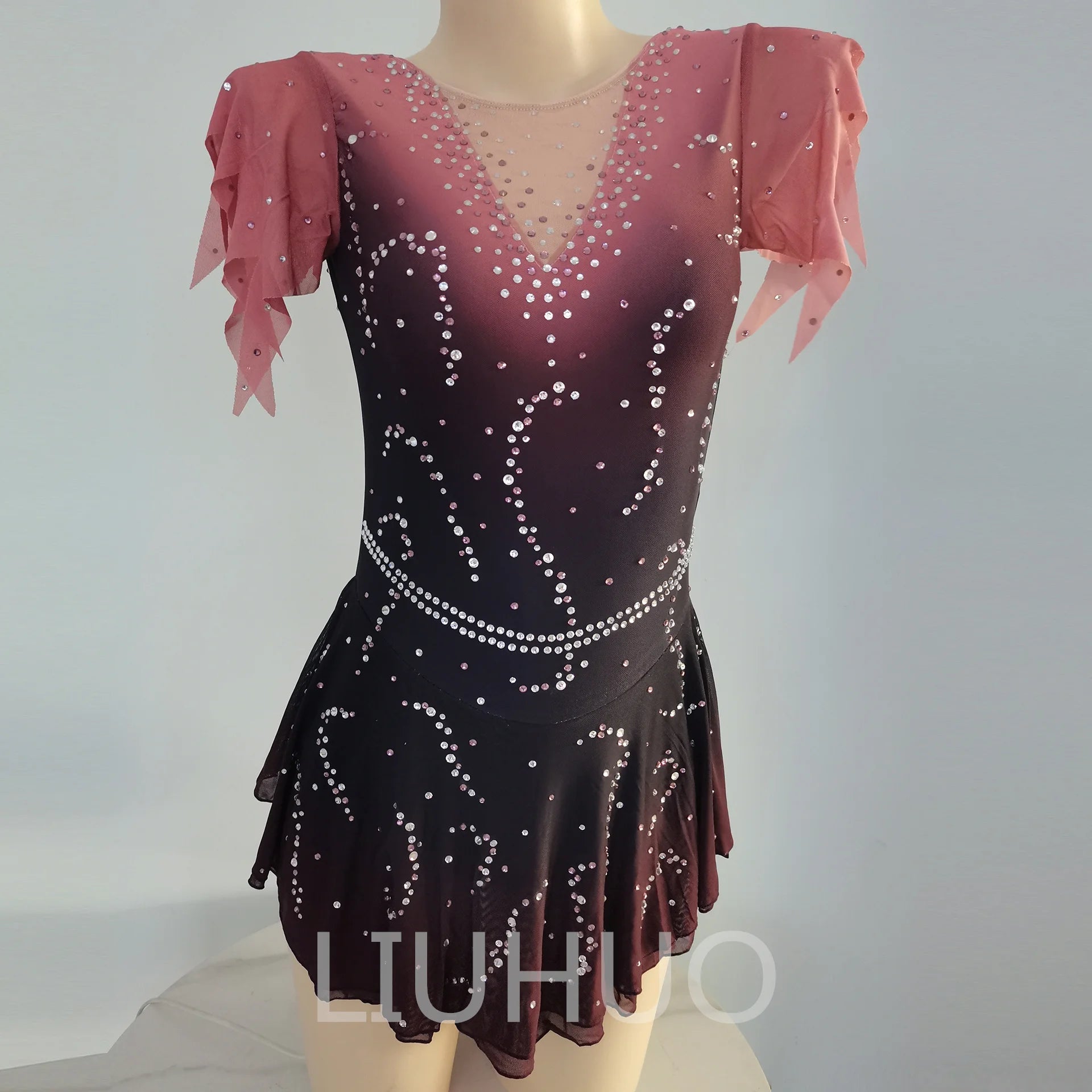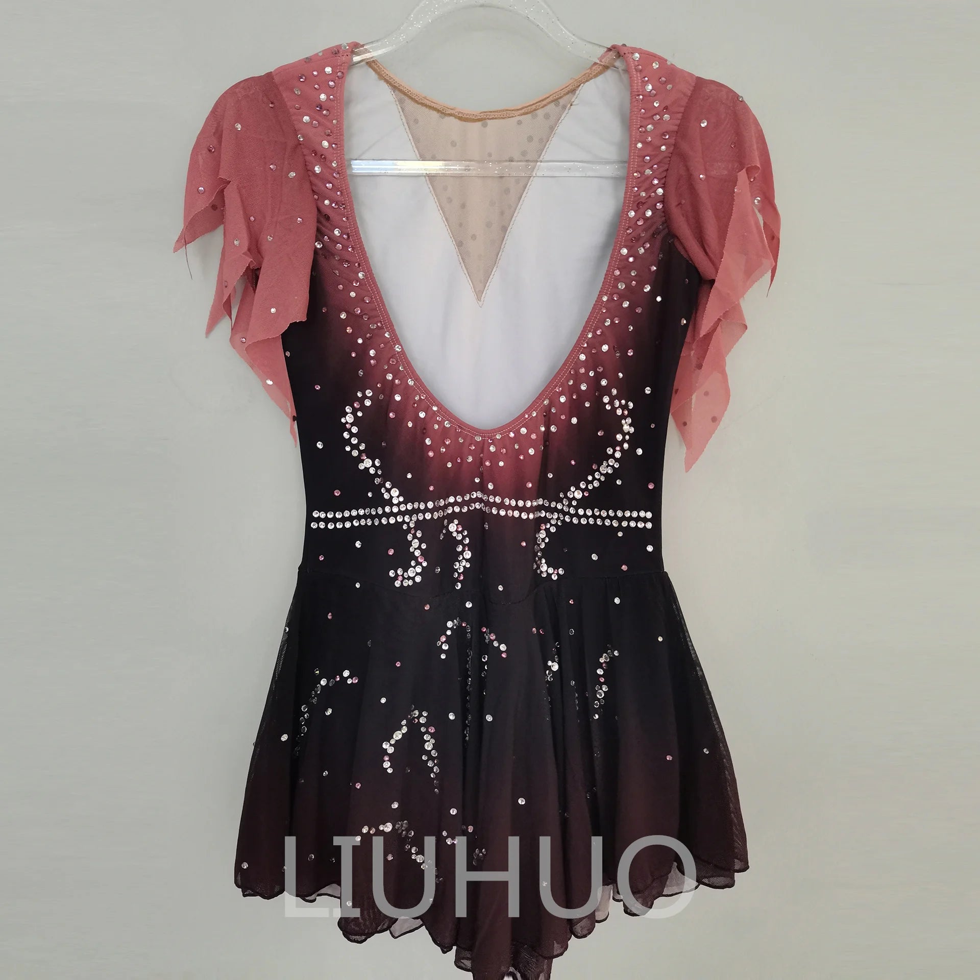 ❤ Features:This is a LIUHUO figure - skating dress. It has a gradient color from pink to dark, decorated with numerous crystals, features sheer flutter sleeves and a V - neck, and is suitable for figure - skating shows.