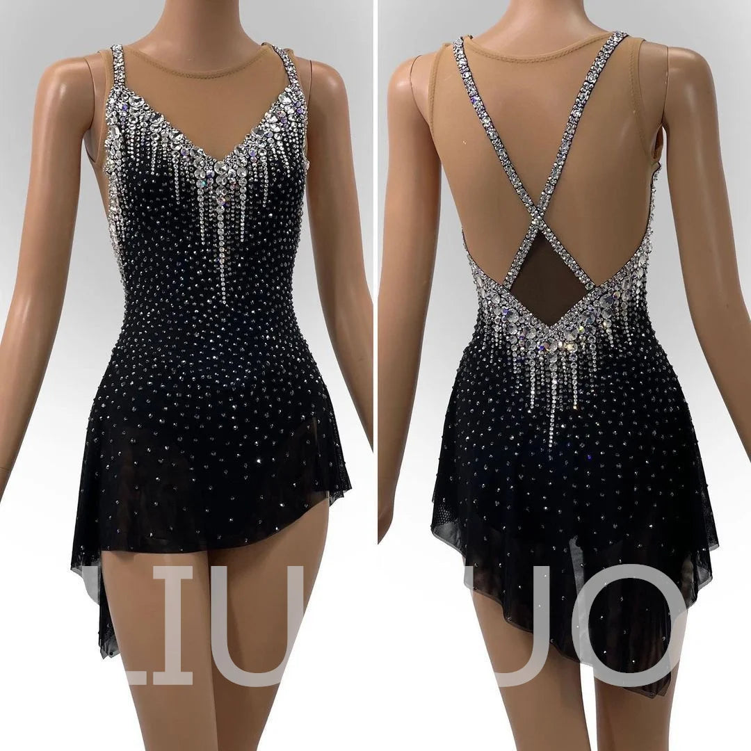 ❤ Features:This is a LIUHUO figure - skating dress. It is black, densely decorated with crystals, has a V - neckline in the front and a criss - cross open - back design, and an asymmetrical skirt, suitable for figure - skating performances.