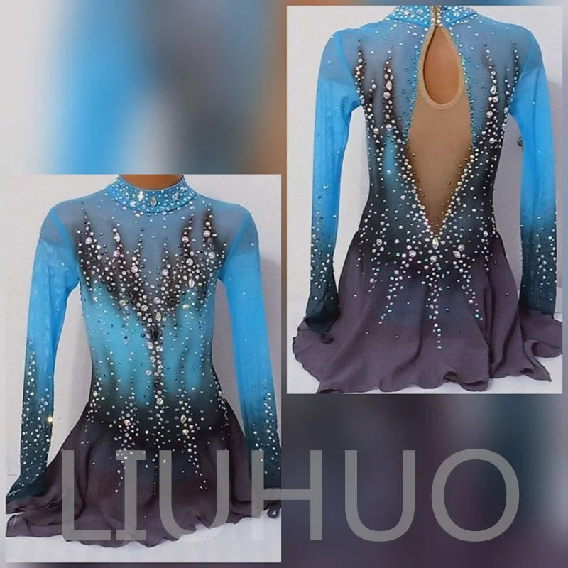 ❤ Features:This is a LIUHUO figure - skating dress. It has a gradient color from blue to dark, decorated with numerous crystals, long sleeves, and an open - back design, suitable for figure - skating performances.