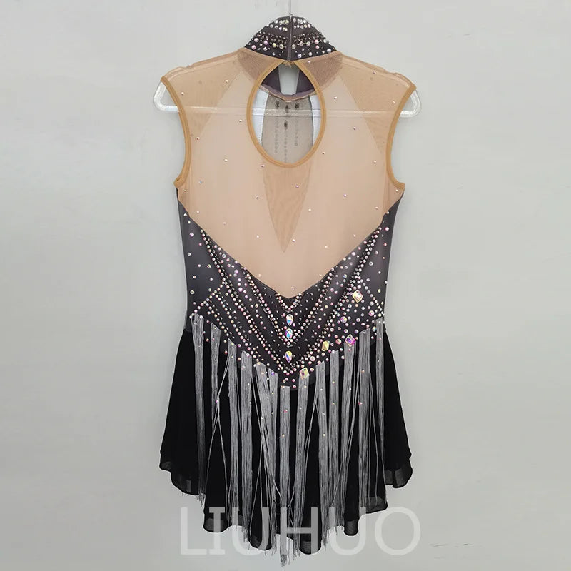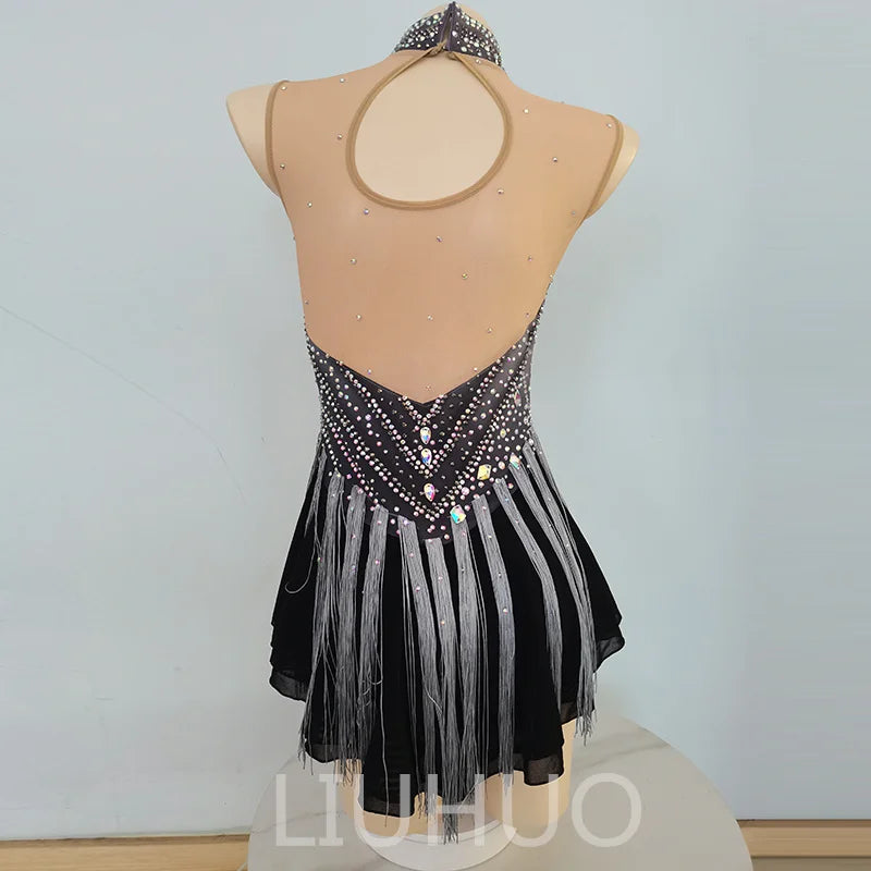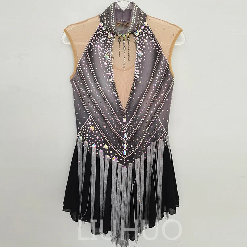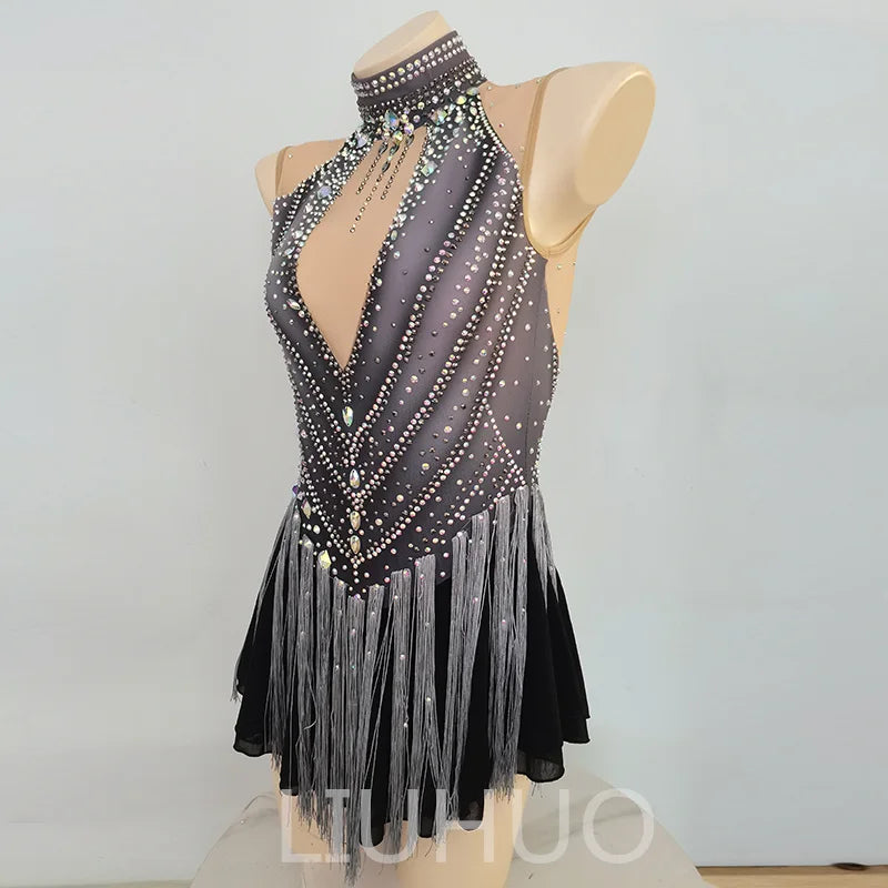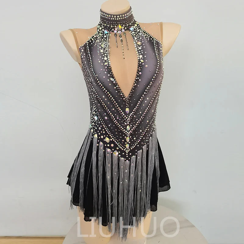 ❤ Features:This is a LIUHUO figure - skating dress. It features a sleeveless design with a deep V - neck, adorned with numerous crystals and silver fringes, and has a high - neckline decorated with a rhinestone - embedded choker, suitable for figure - skating performances.