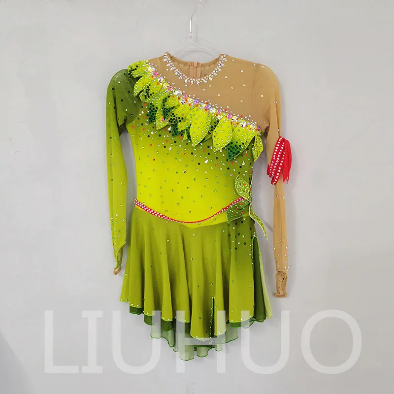 ❤ Features:This is a LIUHUO - brand figure skating performance dress. It is mainly green, featuring a one - shoulder and mesh - spliced design, decorated with leaf shapes, rhinestones, and a red waist belt. It is a customized figure skating dress for children or adult women, suitable for performance scenarios.