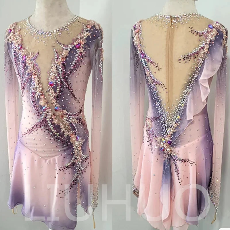 ❤ Features:This is a LIUHUO figure - skating dress. It has a gradient color from pink to purple, decorated with numerous crystals and gemstones, long sheer sleeves, a deep V - neckline in the front and an open back, and is suitable for figure - skating performances, competitions, or shows. It can be a custom - made outfit for figure - skating.