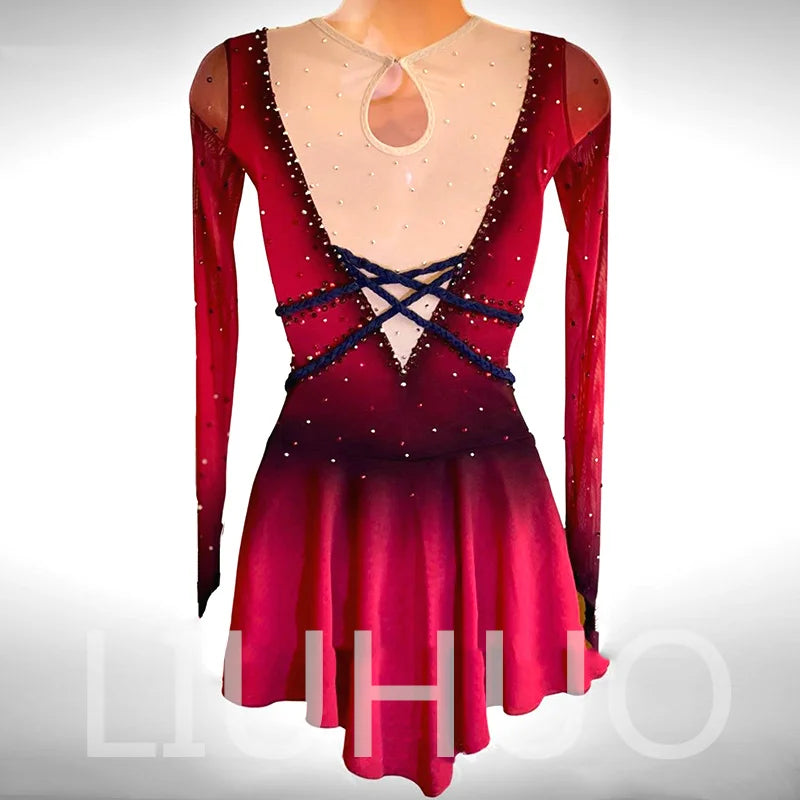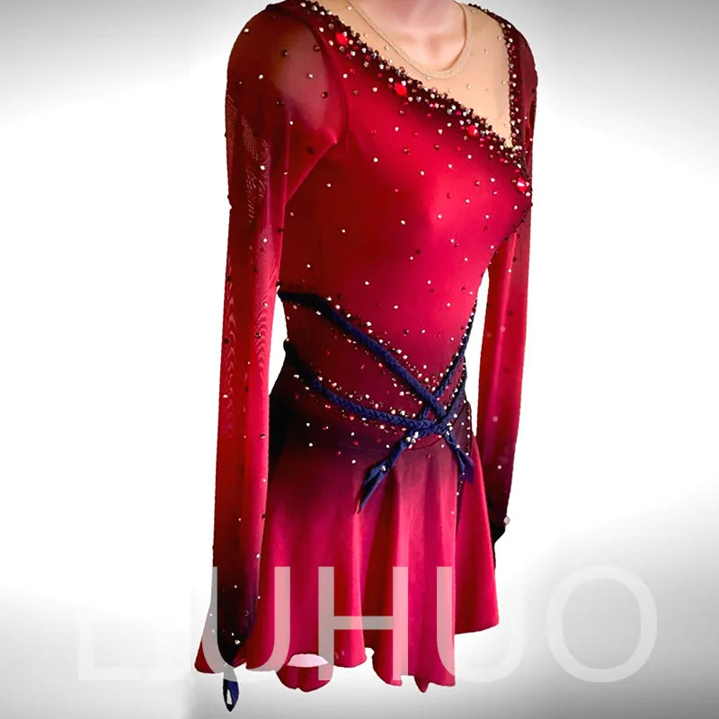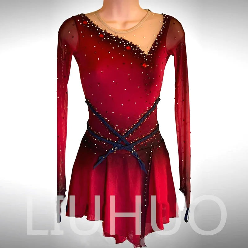 ❤ Features:This is a LIUHUO figure - skating dress. It's a custom - made performance outfit for figure skating, suitable for both children and adult women. The dress features a gradient red color, sheer long sleeves, and is decorated with crystals and a blue - colored waist design.