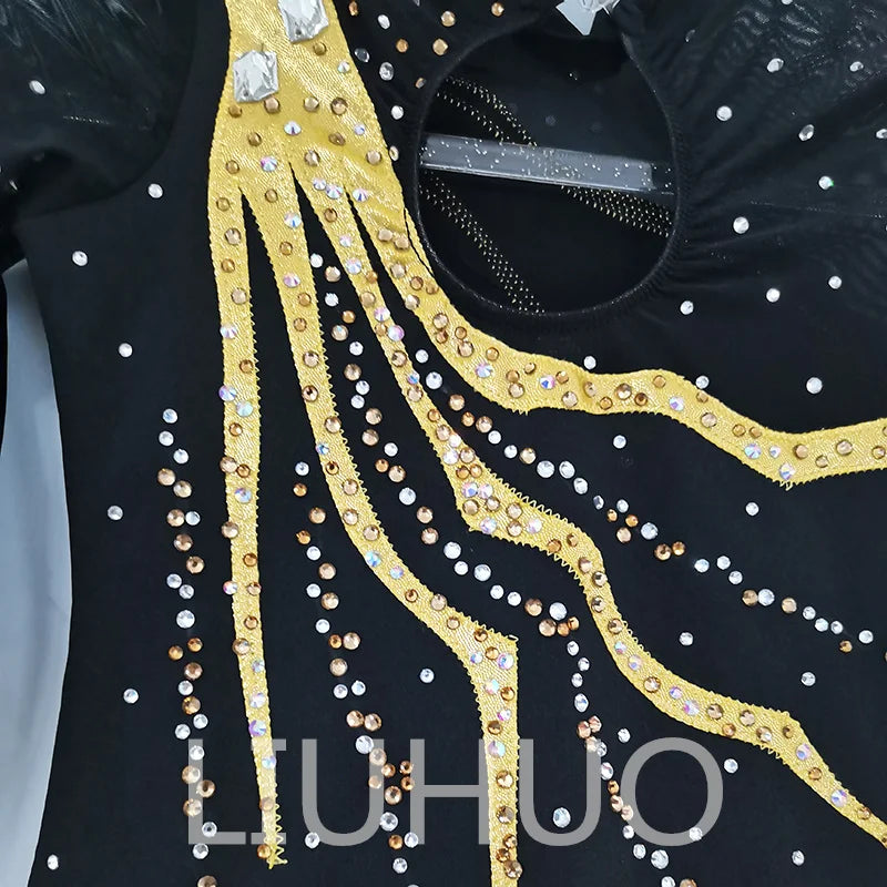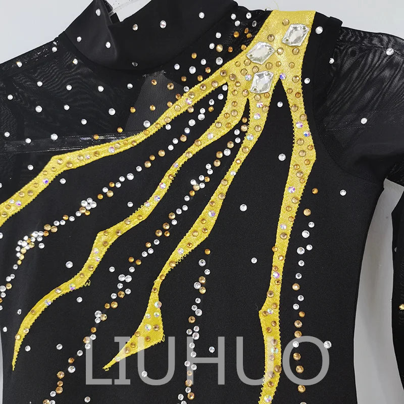 ❤ Features:This is a LIUHUO figure - skating dress. It's mainly black with yellow accents, decorated with gold patterns and crystals, featuring sheer sleeves and a high - neck design, suitable for figure - skating performances.