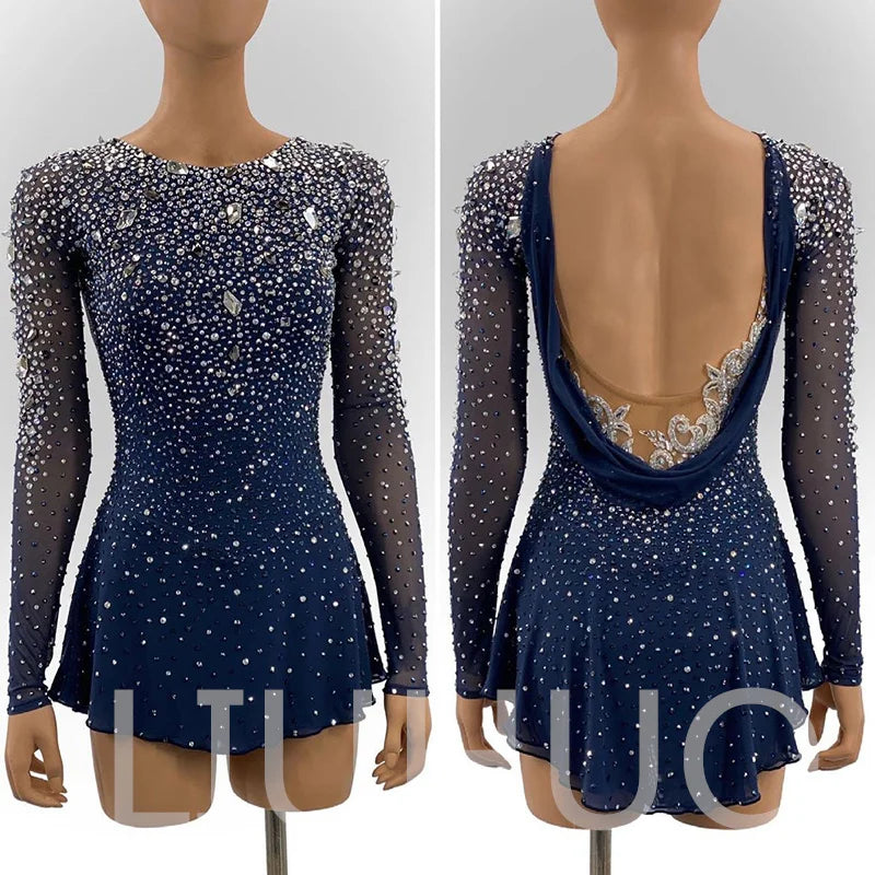 ❤ Features:This is a LIUHUO figure - skating dress. It is dark blue, densely decorated with crystals, has long sheer sleeves, a round neckline in the front and an open - back design with lace - like decorations, suitable for figure - skating performances, competitions, and can be customized for both adults and children as performance or test outfits.