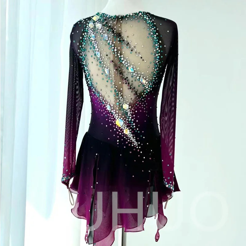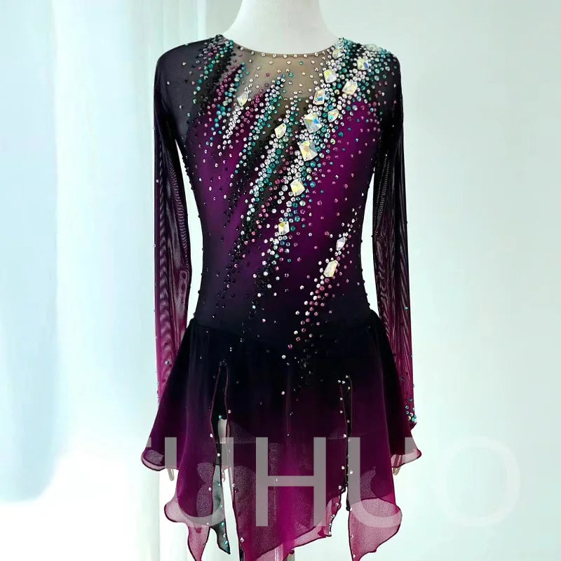 ❤ Features:This LIUHUO figure skating dress features a gradient color from dark to purple. It has sheer mesh sleeves and a neckline area, adorned with colorful rhinestones and crystals in a flowing pattern. The asymmetric skirt adds a dynamic touch, perfect for dazzling on the ice.