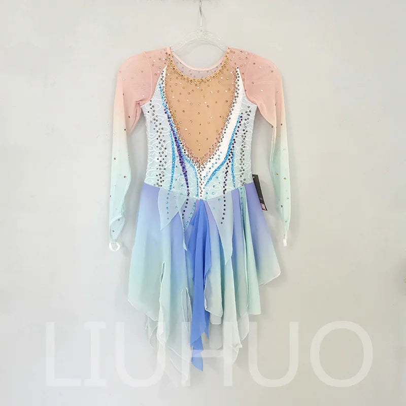 ❤ Features:This is a figure skating dress of the LIUHUO brand. It features a pink - blue - purple gradient color scheme, mesh long sleeves, decorated with rhinestones and unique patterns, and has a gorgeous style, suitable for figure skating performances and other scenarios.