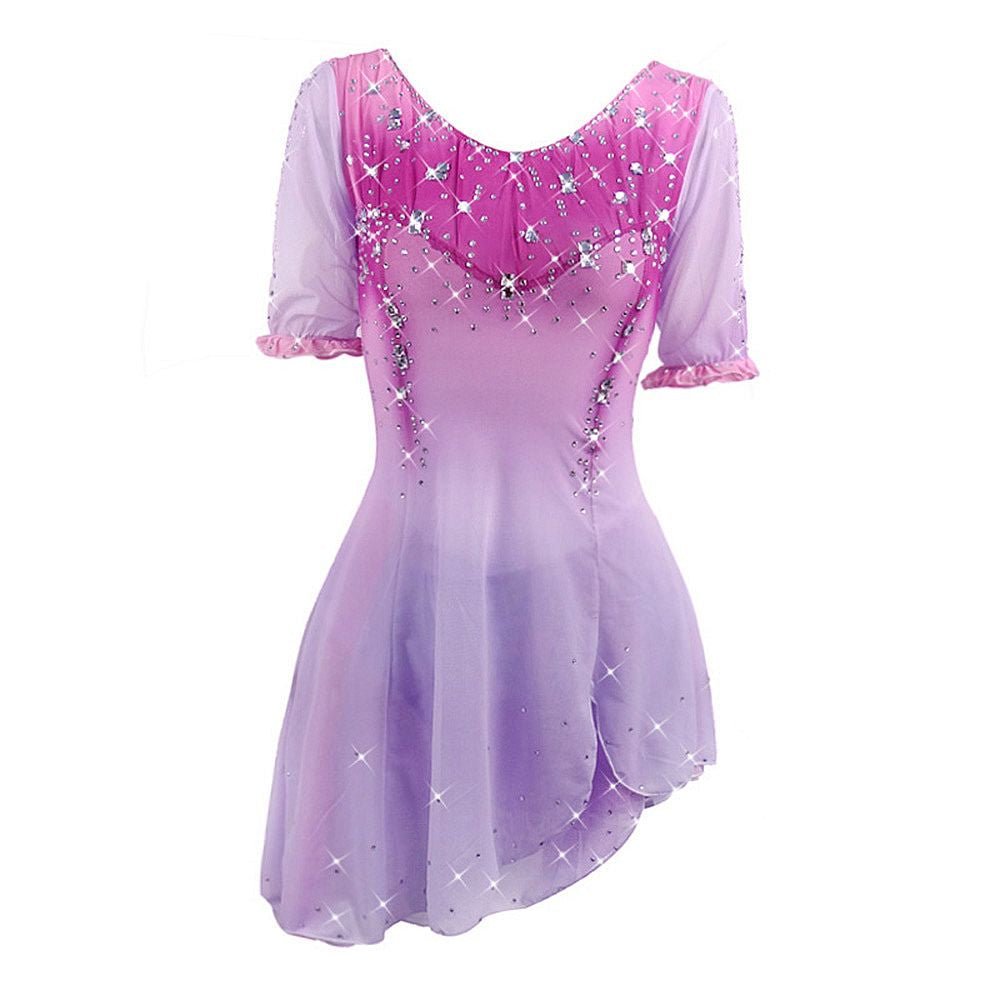 ❤ Features:This LIUHUO figure skating dress shows a gradient from pink to lavender. It has short sheer sleeves with ruffled cuffs. The bodice is decorated with sparkling rhinestones in a star - like pattern, and the asymmetric skirt adds a graceful flow, perfect for skating performances.
