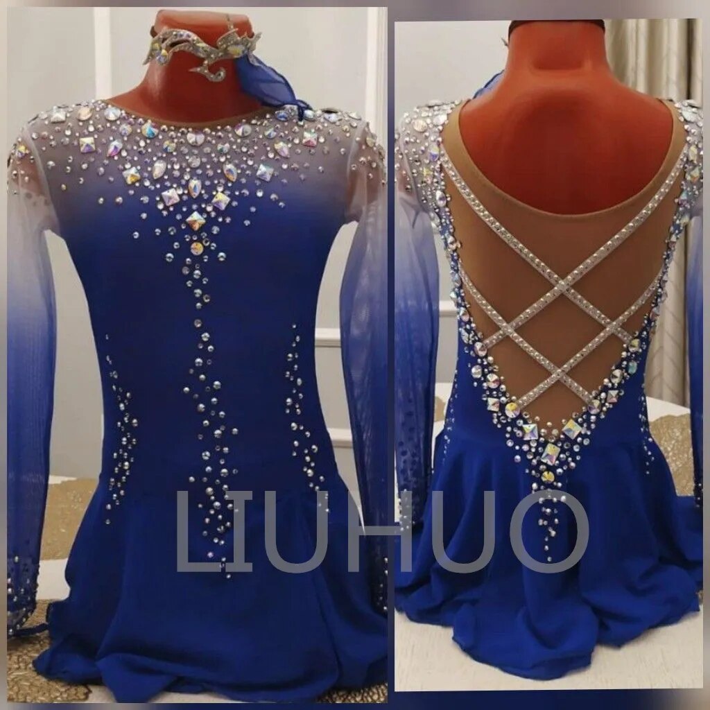 ❤ Features:This LIUHUO figure - skating dress is a masterpiece of elegance and sparkle. In a rich blue shade, it features long, sheer sleeves that add a touch of delicacy. The front is lavishly adorned with numerous rhinestones, creating an eye - catching pattern that flows down the bodice. The back is a standout, with an X - shaped crisscross design also embellished with sparkling stones, set against a sheer panel. Complemented by a flared skirt, this dress combines glamour and functionality, perfect for making a statement on the ice.