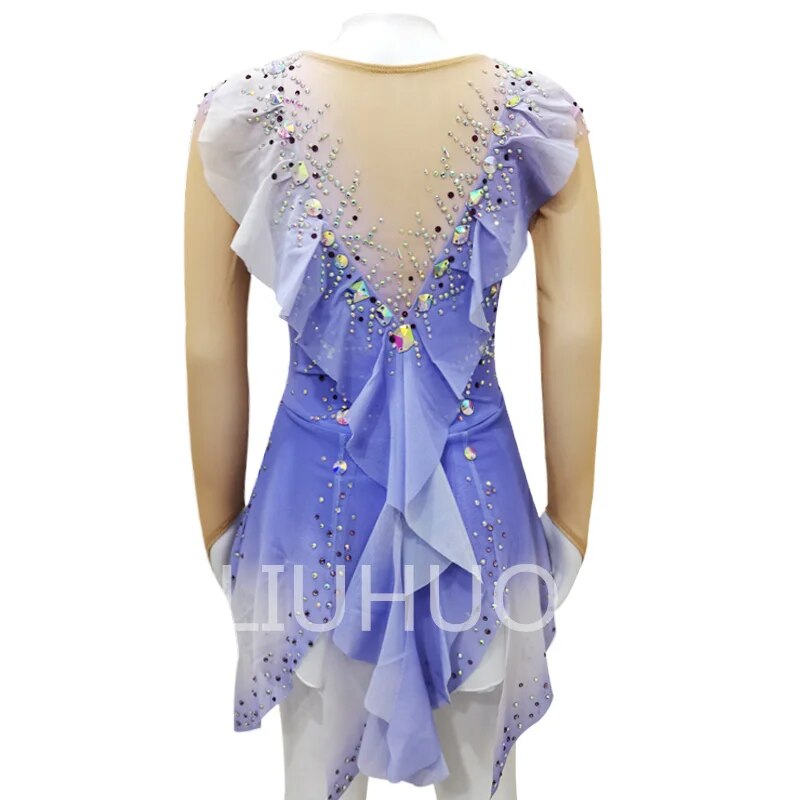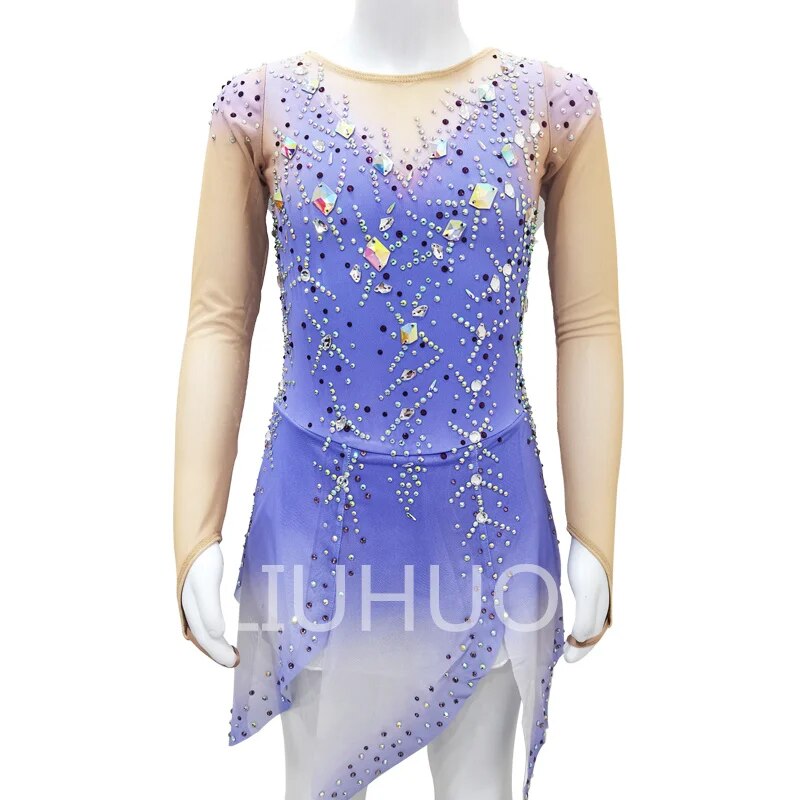 ❤ Features:This LIUHUO figure - skating dress is a stunning piece. It features a beautiful gradient of purple hues, transitioning from a deeper shade at the top to a lighter one towards the bottom. The dress is adorned with numerous sparkling rhinestones and crystals, adding a touch of glamour. The long sleeves are made of sheer, skin - toned fabric, creating an elegant contrast with the vibrant purple body. The hemline is uniquely designed with irregular edges, making it both stylish and suitable for dynamic skating movements.