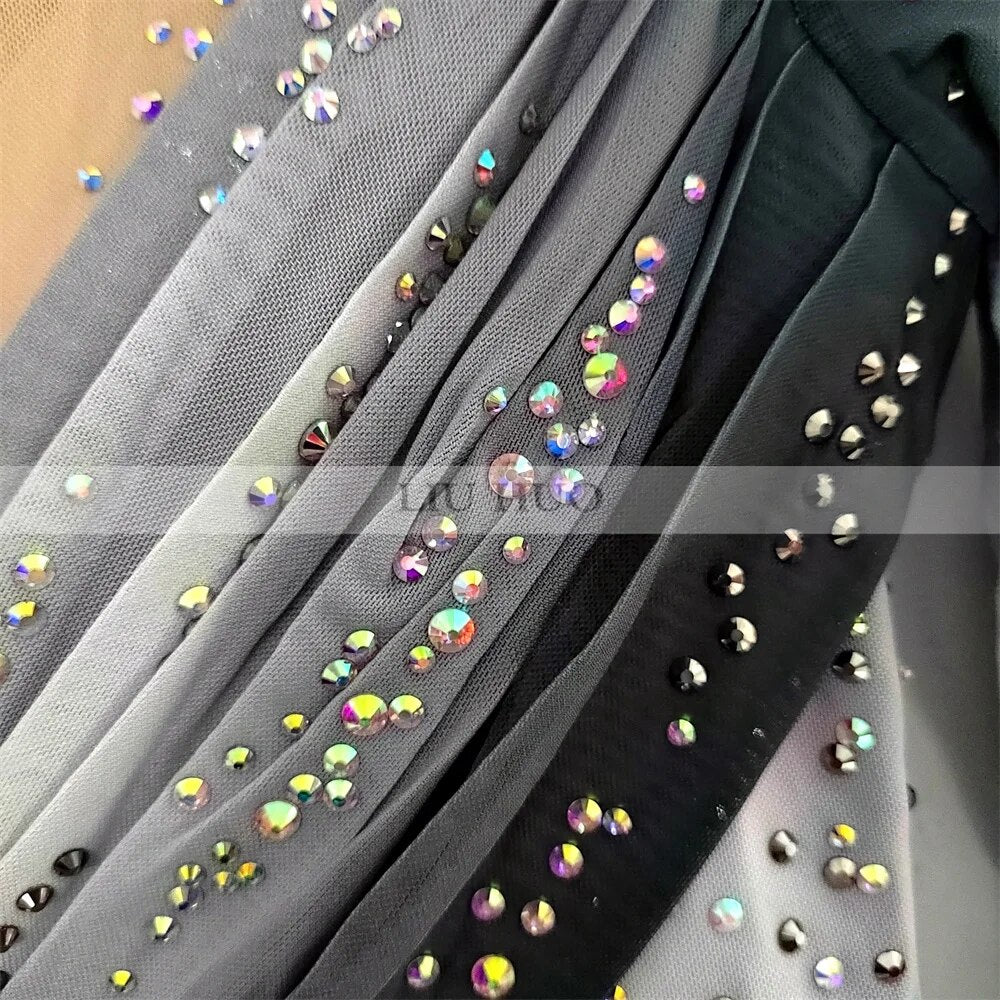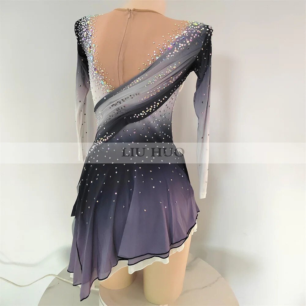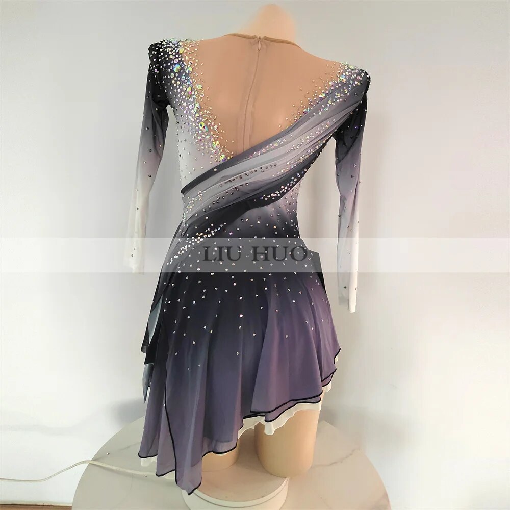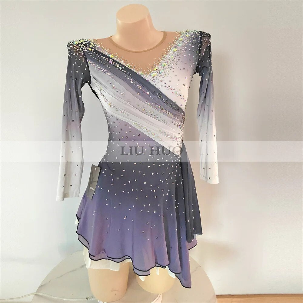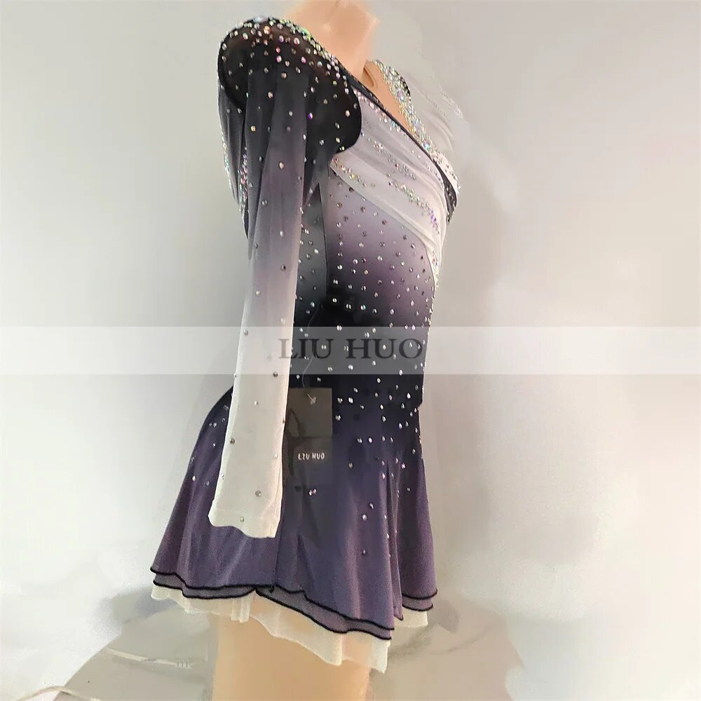 ❤ Features:This LIUHUO figure - skating dress is a paragon of elegance and sparkle. It sports a sophisticated gradient from white to deep purple, creating a visually captivating effect. The long - sleeved design incorporates sheer mesh sections on the upper part, adding an alluring and delicate touch. The bodice features a wrap - around style adorned with an abundance of glittering rhinestones, meticulously arranged in diagonal stripes that enhance the dress's dynamic appeal. The asymmetric flared skirt adds a unique flair, allowing for graceful movement. It's a perfect blend of style and functionality, ideal for figure - skating performances.