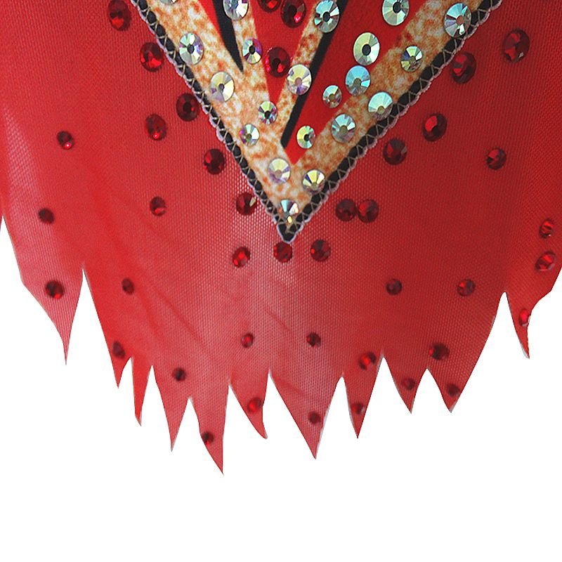 ❤ Features: This LIUHUO rhythmic gymnastics leotard showcases a striking red - dominated design. It has a one - sheer - sleeve style, with intricate patterns formed by gold - toned lines and abundant sparkling rhinestones. The unique, jagged hem adds a dynamic flair, making it eye - catching and suitable for rhythmic gymnastics performances.