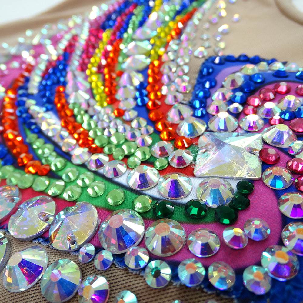 The dress was made by high quality spandex,with plenty of diamonds and  gem of acrylic. Mostly we sell the dress with crystals of  the Middle East.