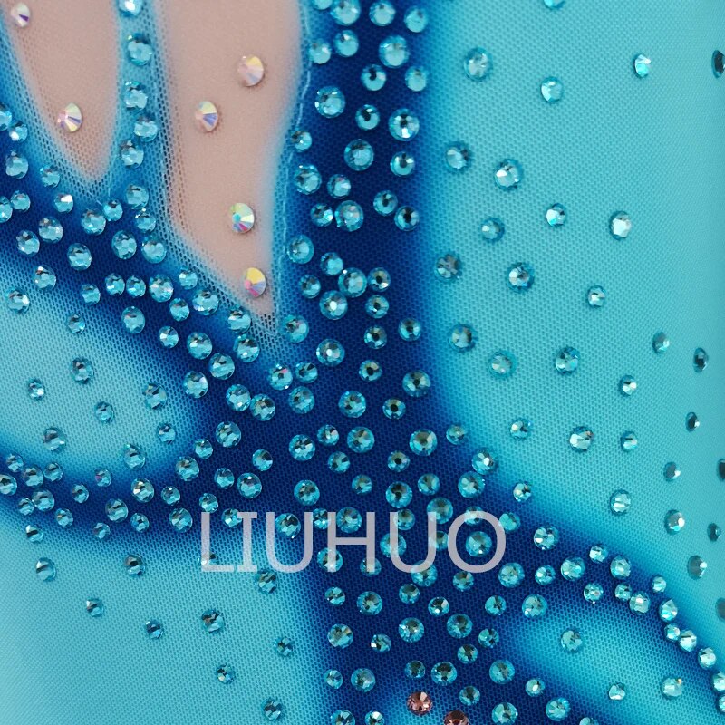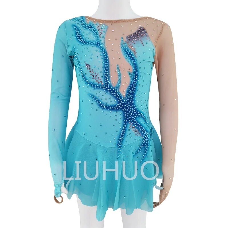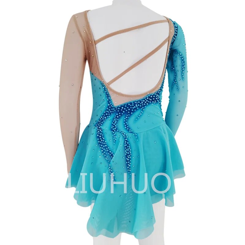 ❤ Features:This LIUHUO figure - skating dress presents a light blue color scheme. The long - sleeved design features a sheer mesh fabric on part of the sleeves and back, adding an elegant and ethereal touch. The back is the highlight, with a large pattern resembling branches or coral intricately decorated with numerous rhinestones, creating a vivid and three - dimensional visual effect. The skirt part is flared, with some rhinestones embellished, echoing the overall style. It combines grace and sparkle, making it suitable for figure - skating performances.