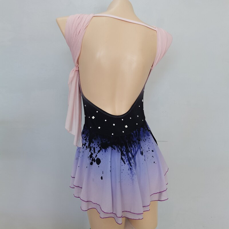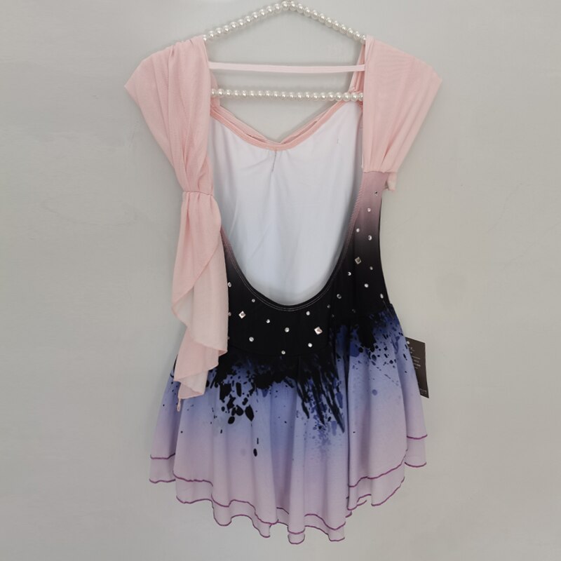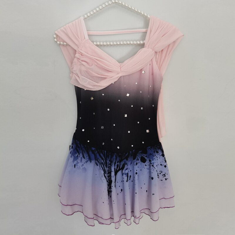 ❤ Features:This LIUHUO figure skating dress is a charming blend of elegance and style. It features a gradient color scheme transitioning from black at the top to soft purples and pinks towards the skirt. The sleeveless design showcases delicate, gathered fabric on one shoulder, adding a touch of grace. The bodice is adorned with small, sparkling rhinestones that catch the light, enhancing its allure. The skirt, with its ruffled hem and artistic black splatter design, allows for fluid movement, making it perfect for skaters to perform with both beauty and freedom on the ice.