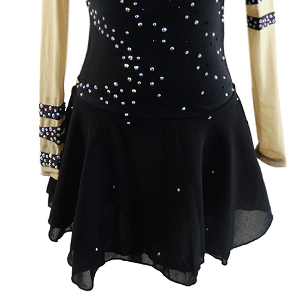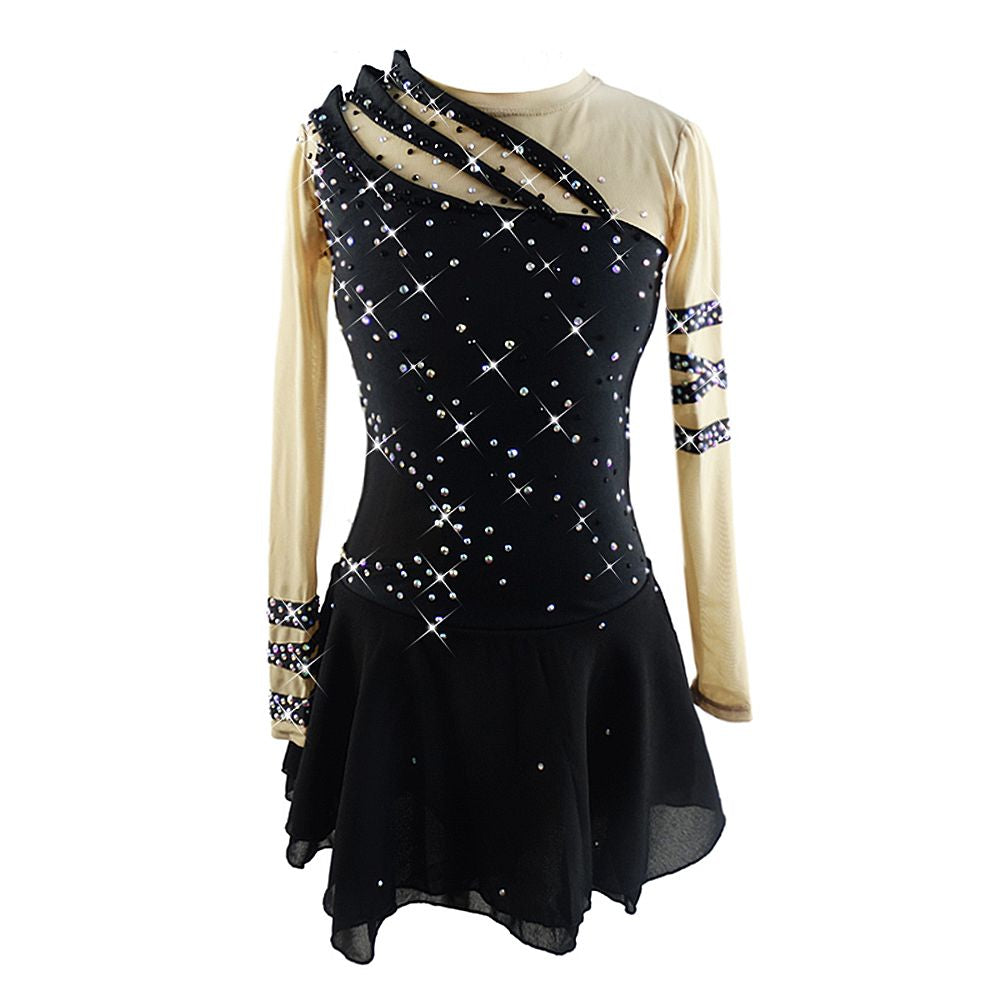 ❤ Features:This LIUHUO figure skating dress is mainly black, featuring a unique asymmetric design with sheer beige sleeves. The bodice is decorated with sparkling rhinestones in a scattered pattern, and the sleeves have stylish rhinestone - striped details. The skirt is a flared, asymmetric style, adding a sense of movement and elegance.