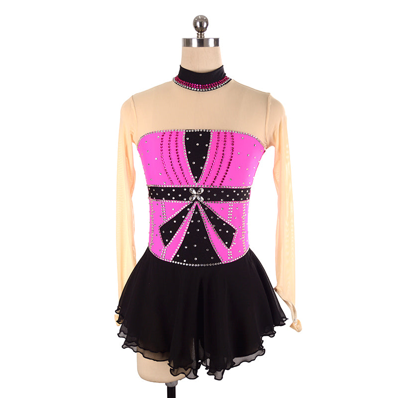 ❤ Features:This LIUHUO figure skating dress features a pink bodice with black accents, sheer beige sleeves, a high - neckline adorned with pink and rhinestones, and a black flared skirt. It has a bow - like design on the waist with rhinestone embellishments, creating a glamorous look for skating.